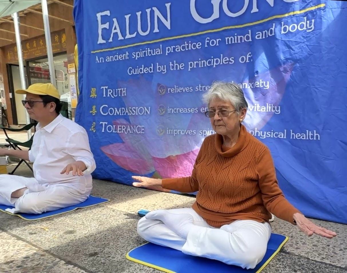当天下午,伴随着舒缓、祥和的炼功音乐,法轮功学员演示了法轮功五套功法。纯正的能量,缓、慢、圆的功法,使不少人想学炼法轮功。