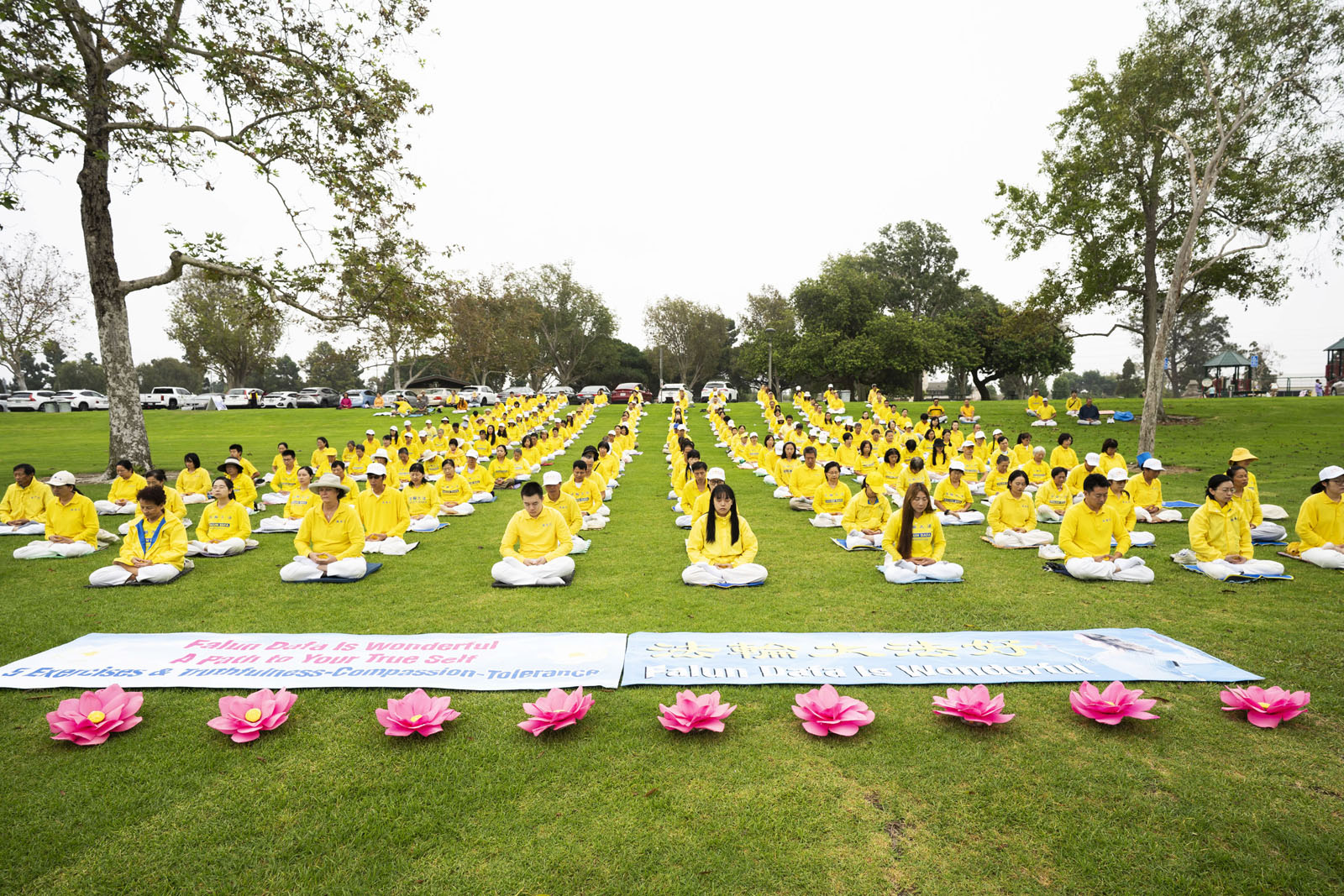 图1:二零二五年九月二十一日,大洛杉矶地区部份法轮功学员聚集在橙县芳泉谷市的英里广场区域公园,恭祝法轮功创始人李洪志大师中秋节快乐。