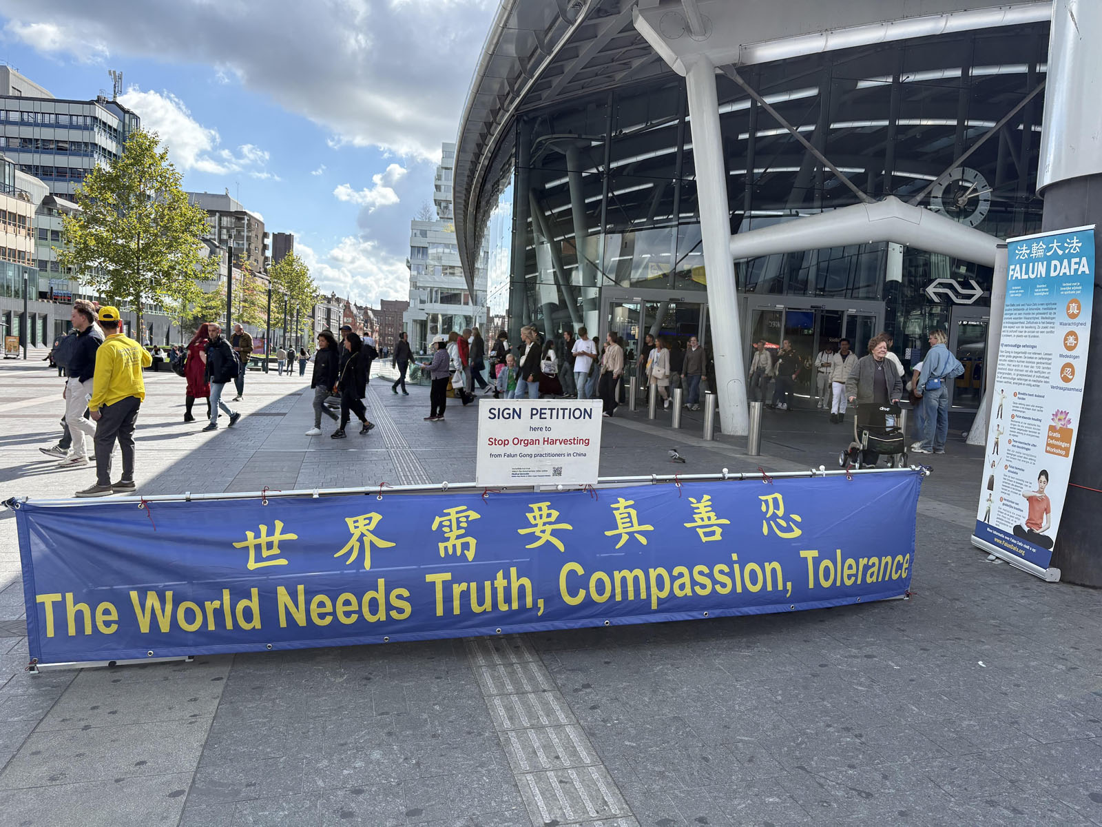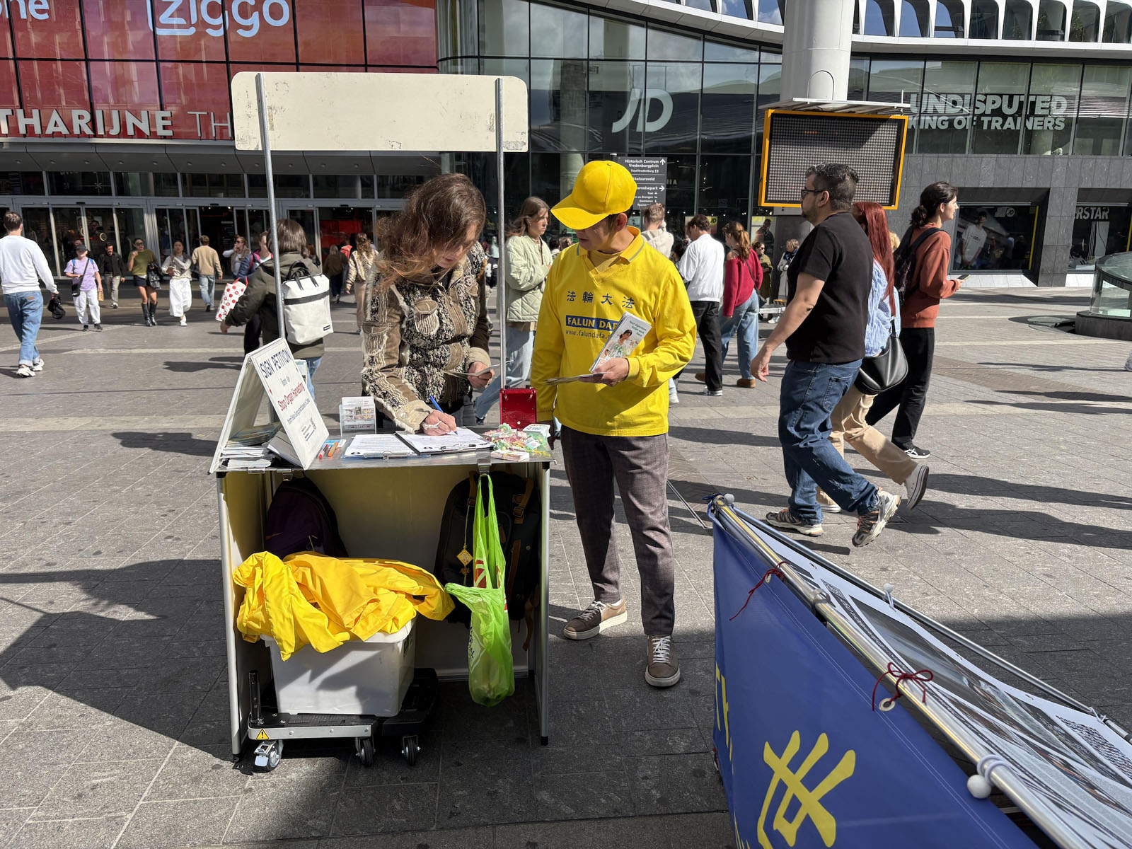 二零二五年九月十四日,成百上千人路过乌得勒支中央火车站外法轮功学员的信息亭。许多人驻足阅读横幅上的内容,并与法轮功学员交谈,有很多人第一次了解到这场迫害。