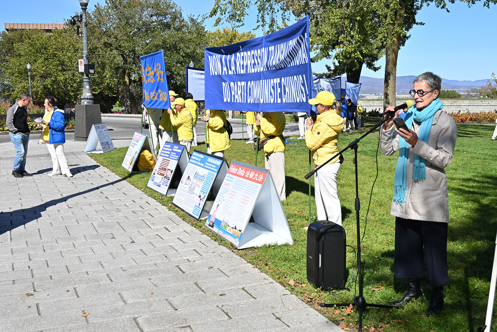 魁北克法轮大法学会会长妮可·米洛特(Nicole Milot)在活动上发言。她讲述了中共在魁北克对修炼真、善、忍的法轮功学员进行跨国镇压的严重情况。