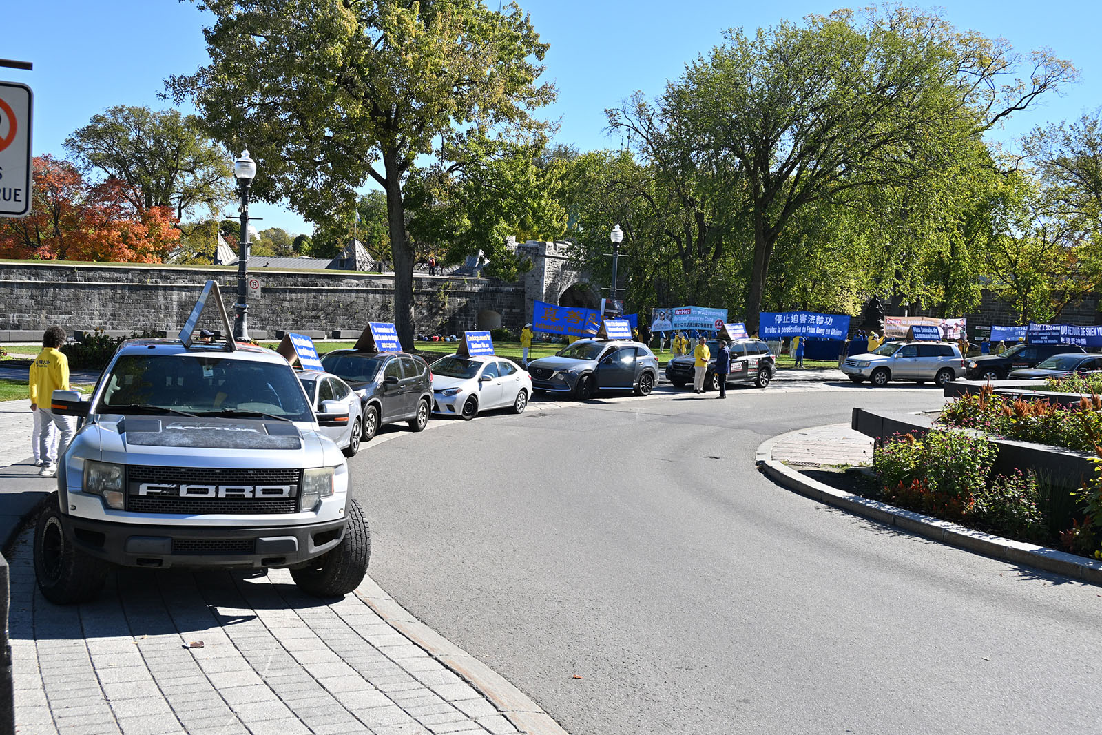 图9~10:活动期间,学员们组织了揭露中共迫害的汽车游行,队伍从国会大厦出发,终点是加拿大最繁忙的购物中心之一圣福伊广场。
