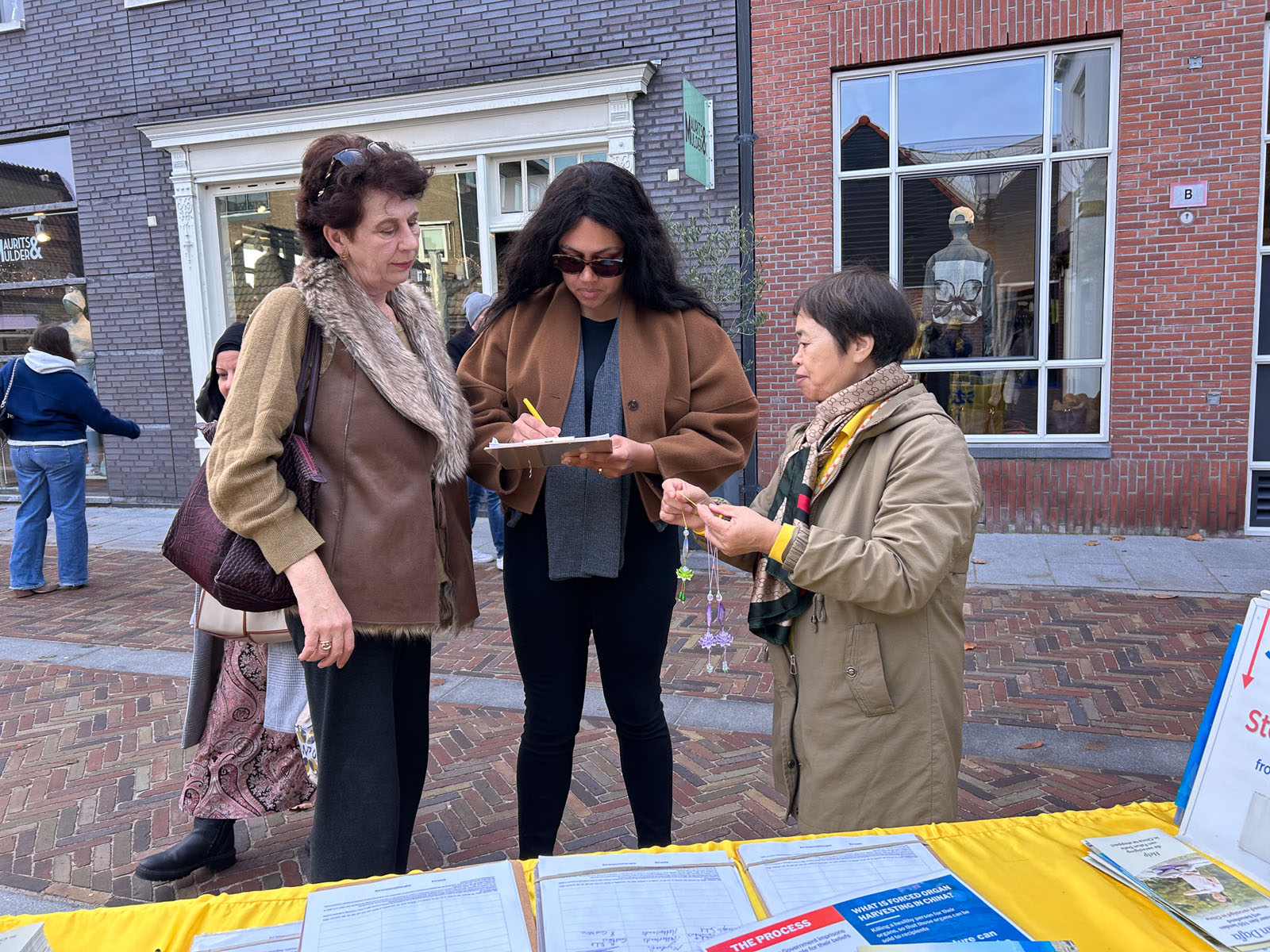 中午,法轮功学员刚刚在长街(langstraat)上布置好真相展位,《瓦瑟纳尔新闻报》就来采访,摄影记者非常喜欢法轮功学员的打坐。应他的要求,学员们集体展示法轮功第五套功法。当地居民看到在脸书上发布的消息后,纷纷来签名支持法轮功信息日活动。