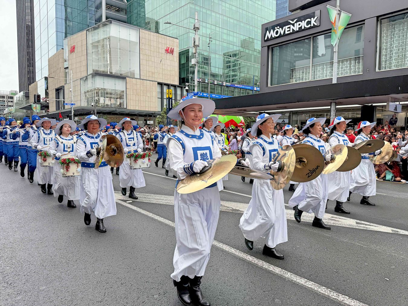 当由澳洲、新西兰法轮功学员组成的天国乐团以整齐的队伍、雄壮的军乐曲风亮相时,全场立刻爆发热烈掌声,不少民众举起手机抓拍精彩瞬间。天国乐团蓝白相间的古典服饰、饱满宏亮的铜管乐声与现场节庆气氛完美融合,令许多观众连连称赞。美丽的法船上中英文真、善、忍理念非常醒目,紧随其后的舞龙队以灵动的龙身、富有动感的节奏,引发孩子们阵阵惊呼,街道两旁的人群不断挥手致意。