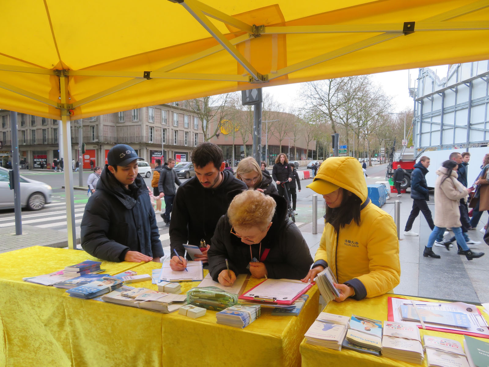 二零二五年十一月二十九日星期六,在南特市埃吕斯广场(Place de l’écluse),法国西部地区的法轮功学员设立了展台,向路人介绍法轮功及在中共对法轮功学员的迫害。