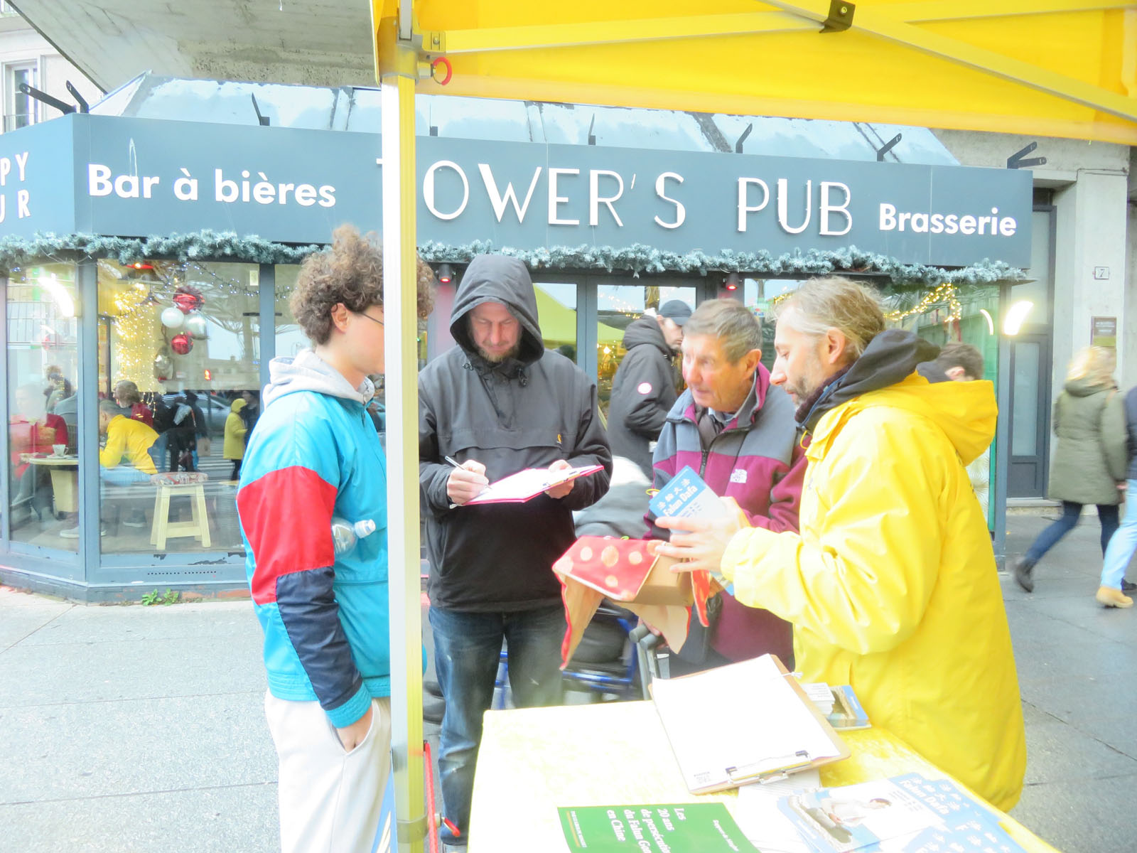 十一月二十九日下午,在亚棉的阿尔方斯·菲凯广场(Place Alphonse Fiquet)广场,法轮功学员进行了讲真相和征签活动。正赶上这里的圣诞市场开启,来往的行人很多。尽管下着小雨,人们认真倾听法轮功学员的讲解,几乎所有听到真相的人都在反活摘征签表上签字,希望停止迫害。