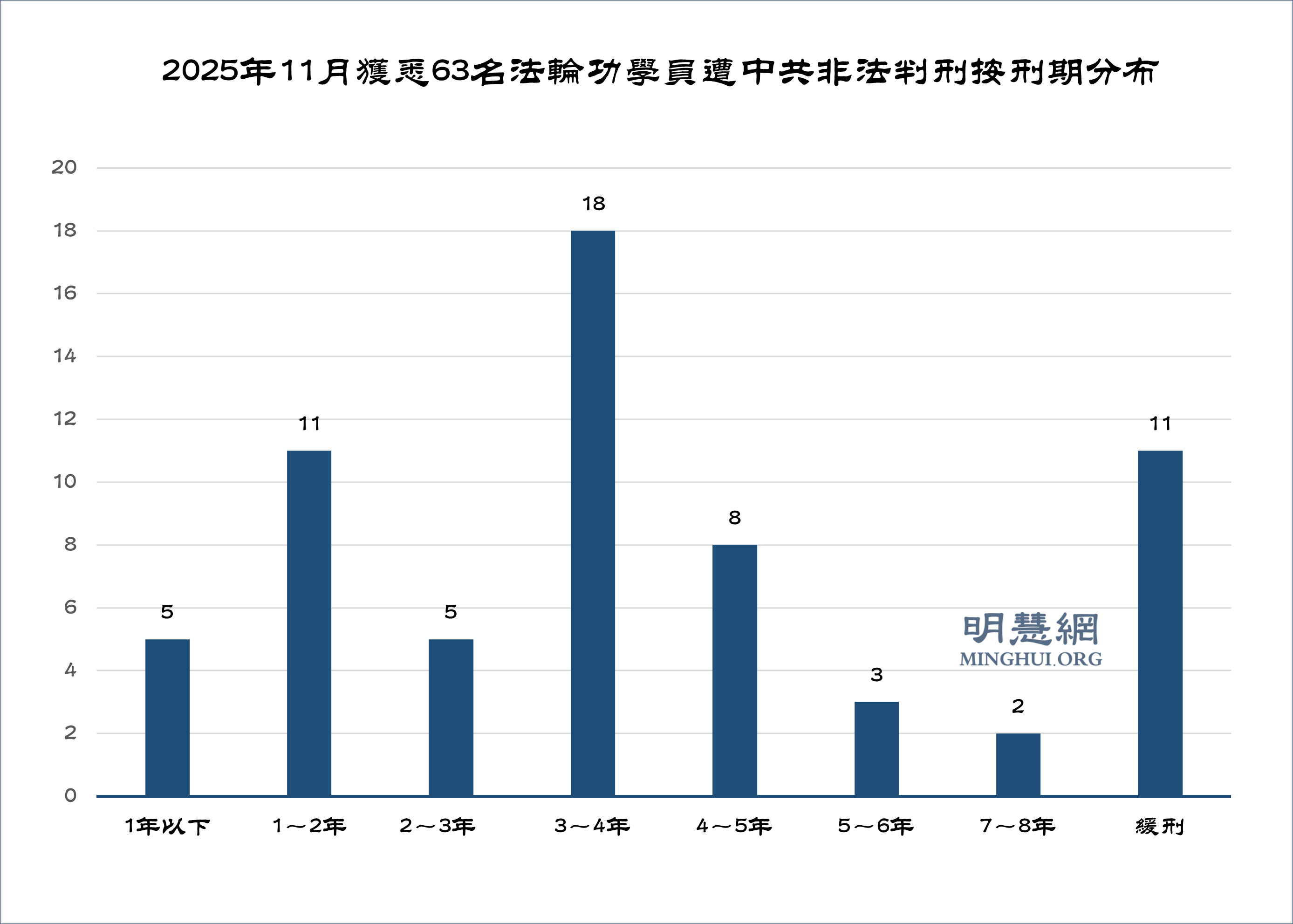 ![]() 图2:2025年11月获悉63名法轮功学员遭中共非法判刑按刑期分布 |