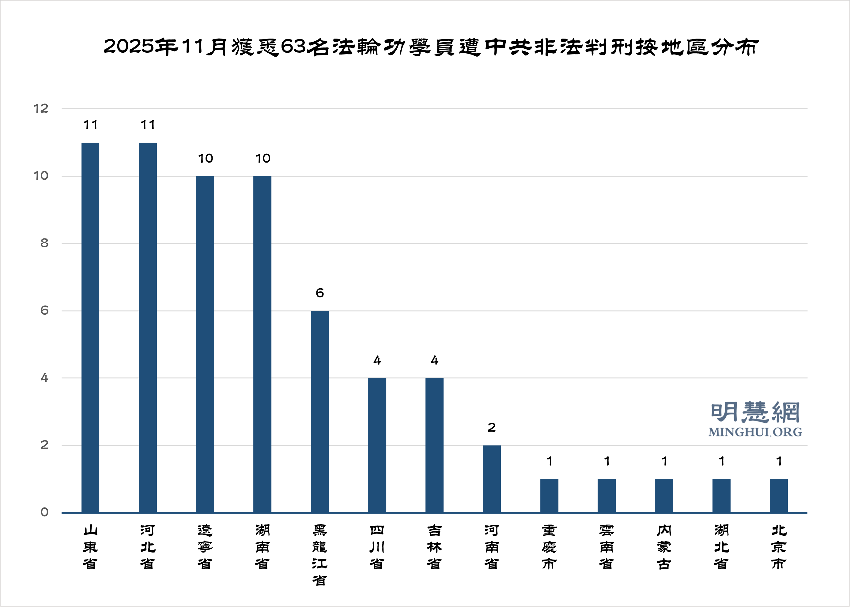 ![]() 图3:2025年11月获悉63名法轮功学员遭中共非法判刑按地区分布 |