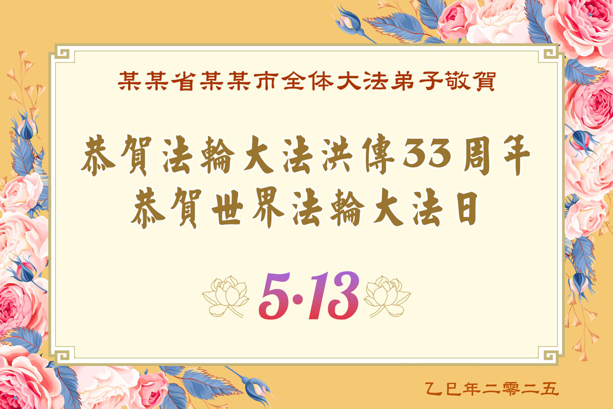二零二五年“五·一三”世界法轮大法日快要到了。建议同修们在设计贺卡时,把标题、所在地区、落款设计的字体适度、清晰可见,即使是以小图片格式呈现在节日问候内容网页时,也能辨别贺卡来源地区。请参考以下明慧网提供的贺卡模板标题和落款的字体大小: