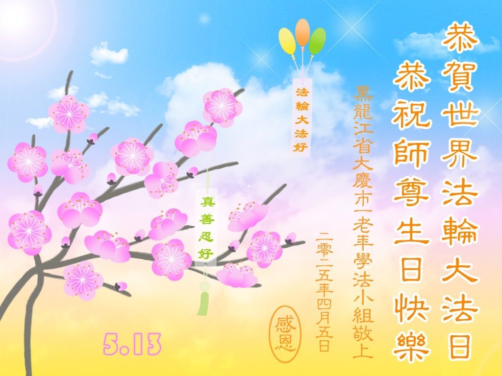 五月十三日,世界法轮大法日到来之际,中国各地学法小组的大法弟子们同庆同祝这神圣的日子,深深感念师尊的慈悲救度,恭贺师尊华诞。