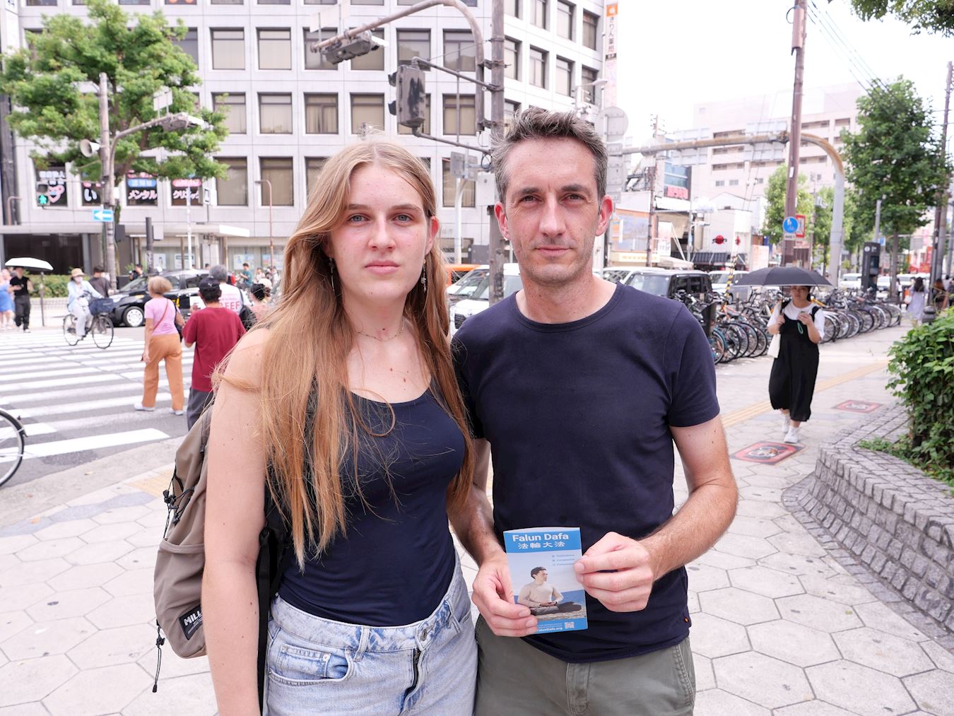 游行当天上午,法轮功学员分成多组在各大景点炼功。来自澳大利亚的罗恩(Ron)先生看到在著名景点大阪城公园炼功的法轮功学员,了解真相后表示:“非常认同真、善、忍的价值观,这真的非常重要。”