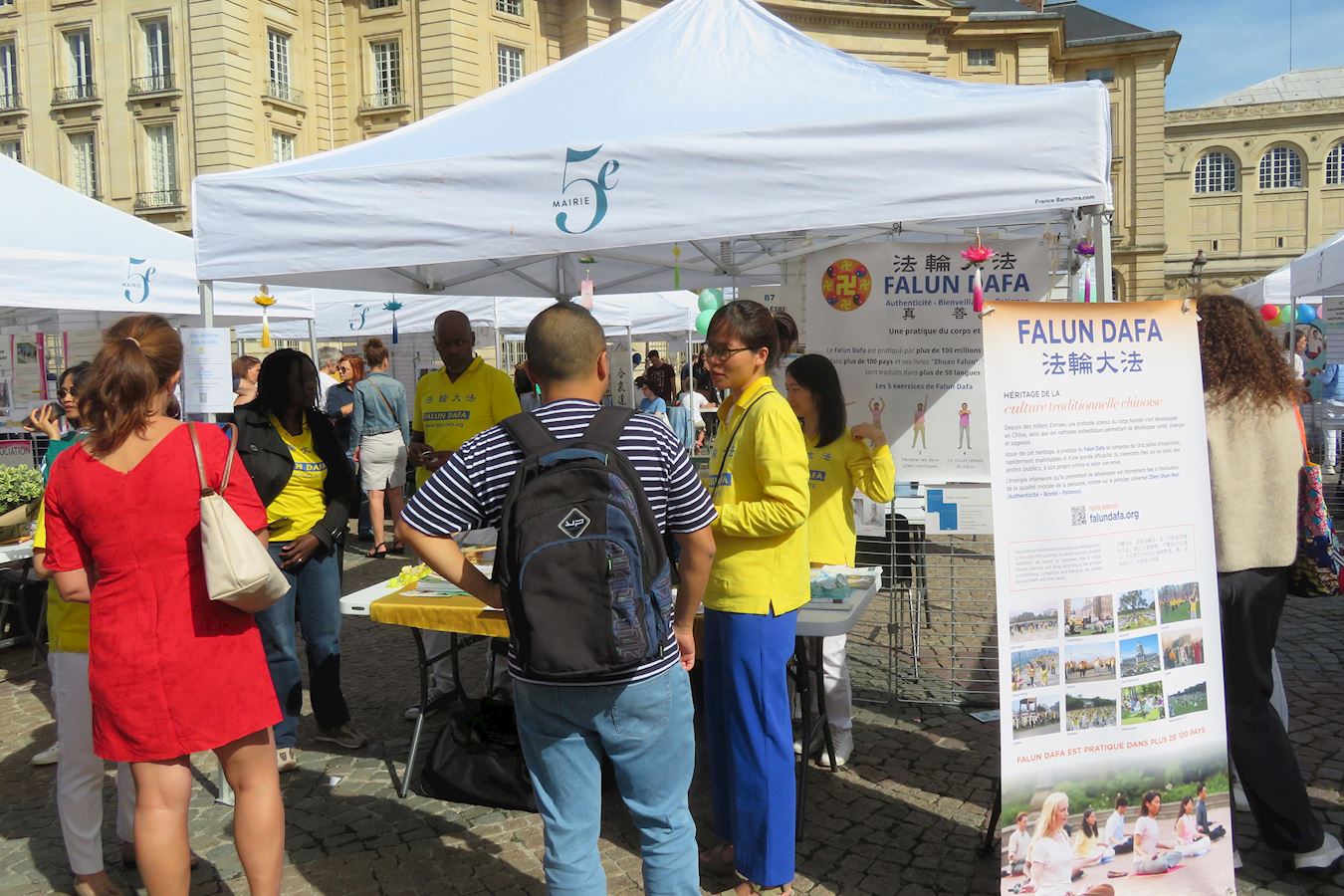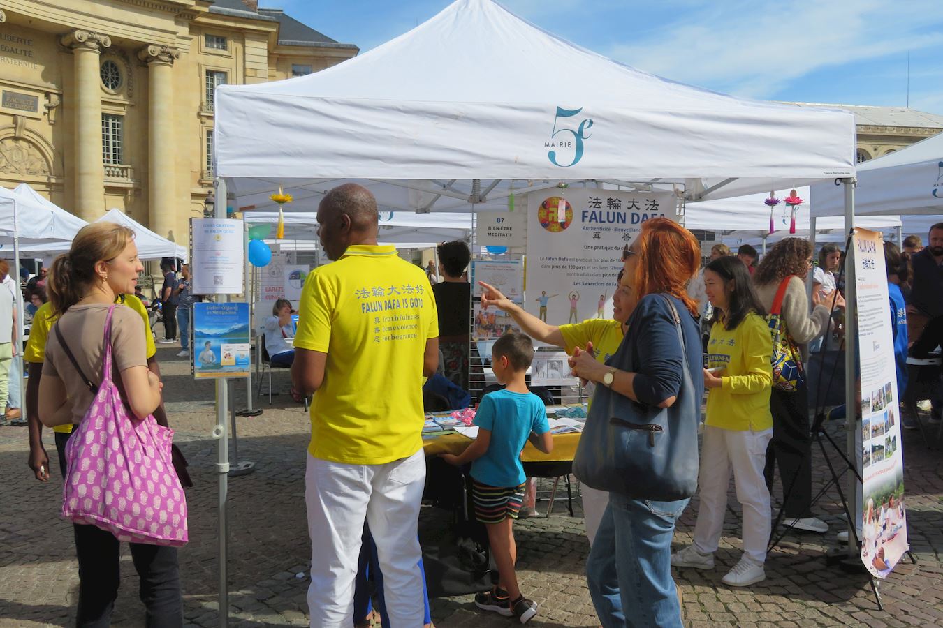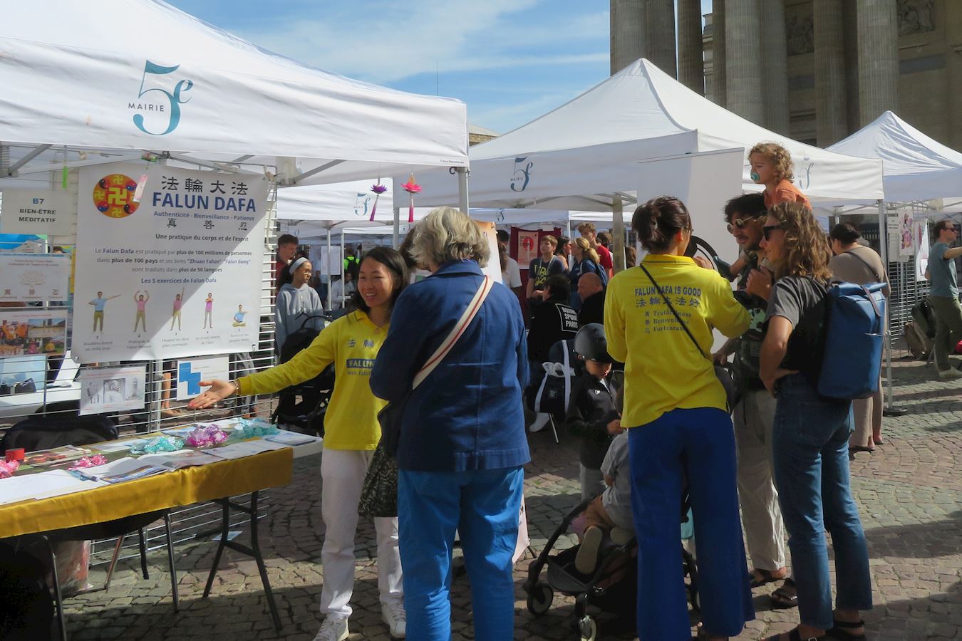 图1~5:九月六日,在巴黎先贤祠广场五区市政府举办的协会论坛上,法轮功学员展示法轮功功法,向民众介绍法轮功。