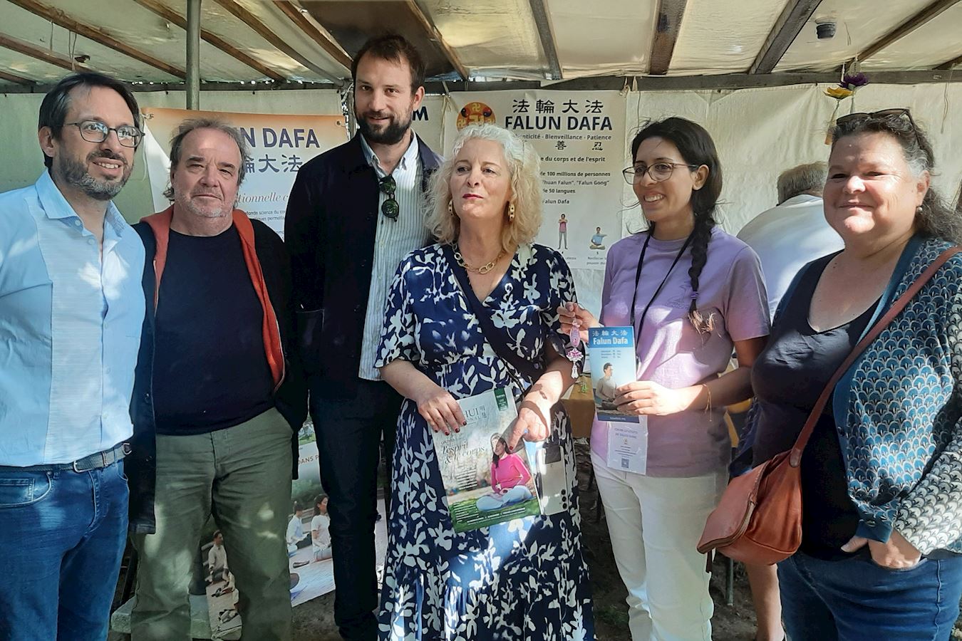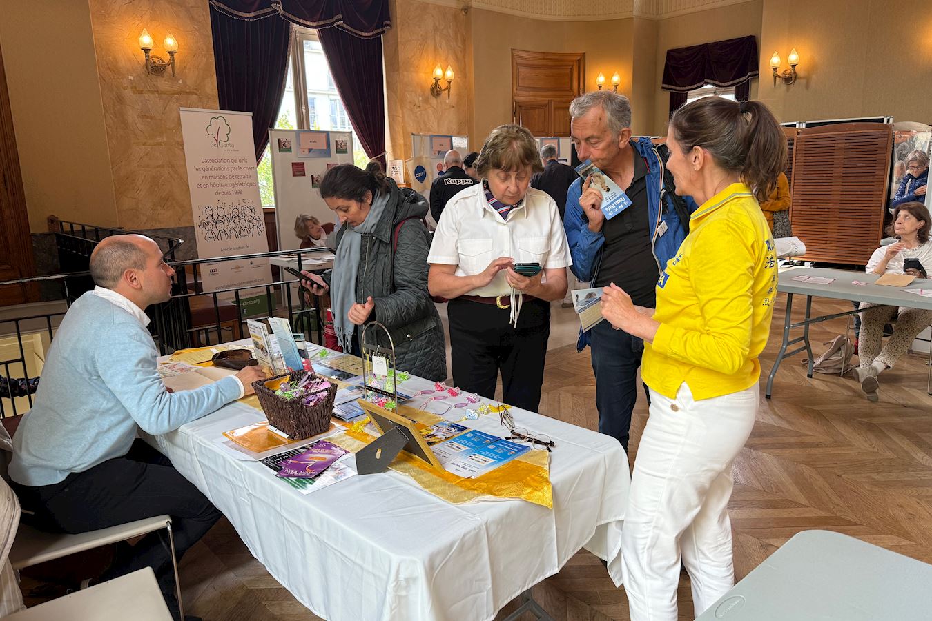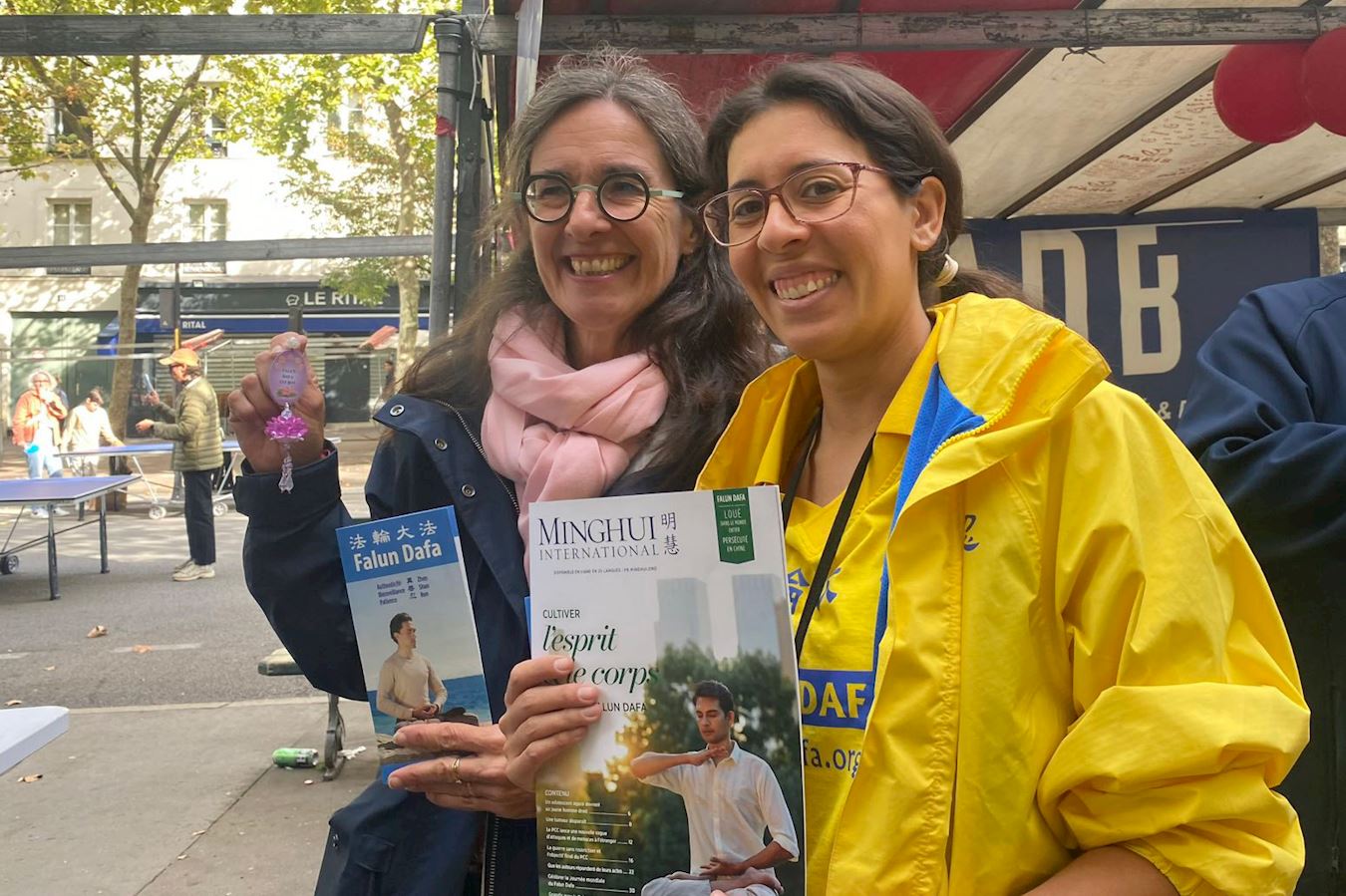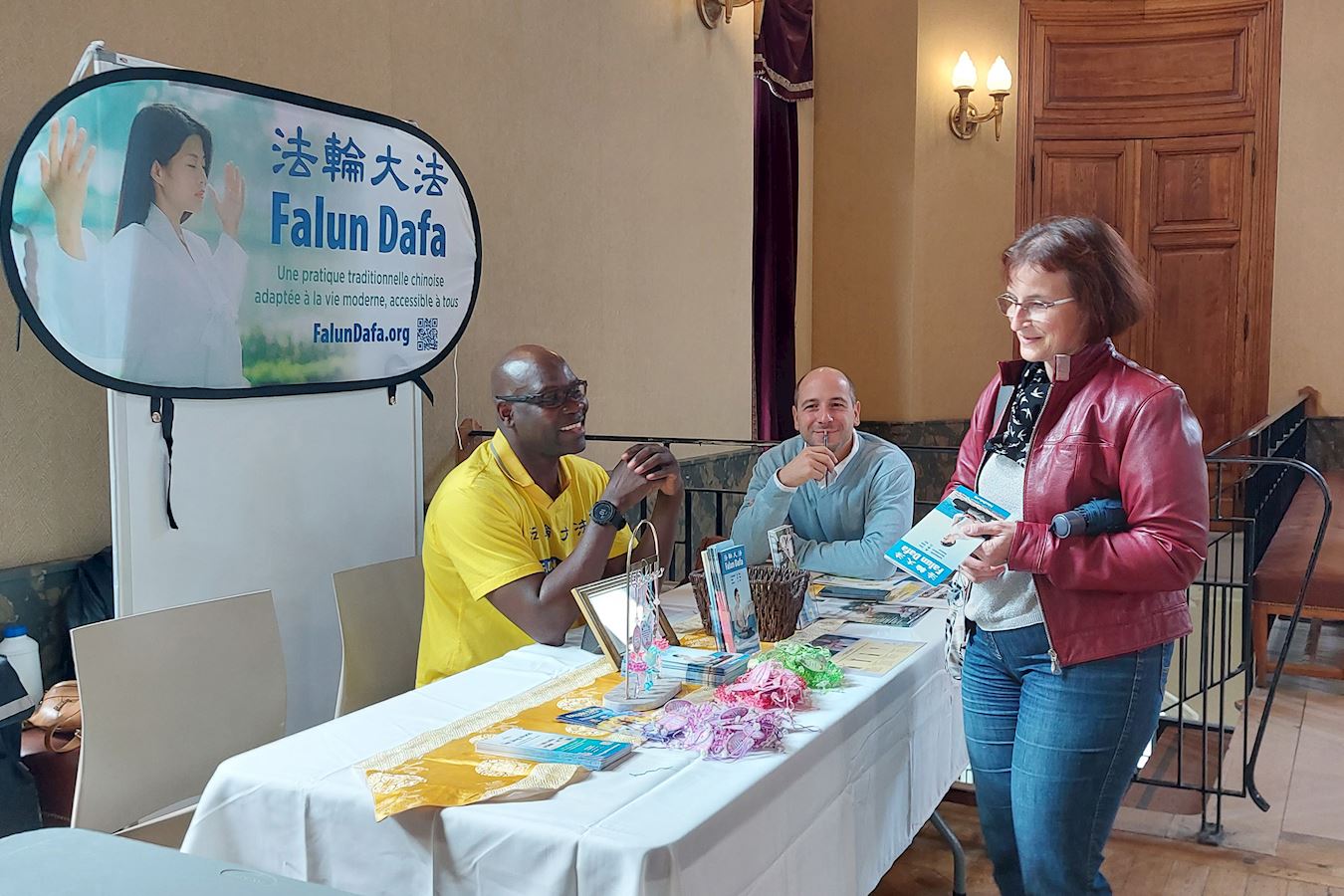 九月七日,在巴黎第十区的协会论坛上,法轮功学员设立展位,传递法轮功相关信息。市长亚历山德拉‧科尔德巴德(Alexandra Cordebard)女士对法轮功学员说:“真、善、忍太美妙了,这正是我今天需要的。”