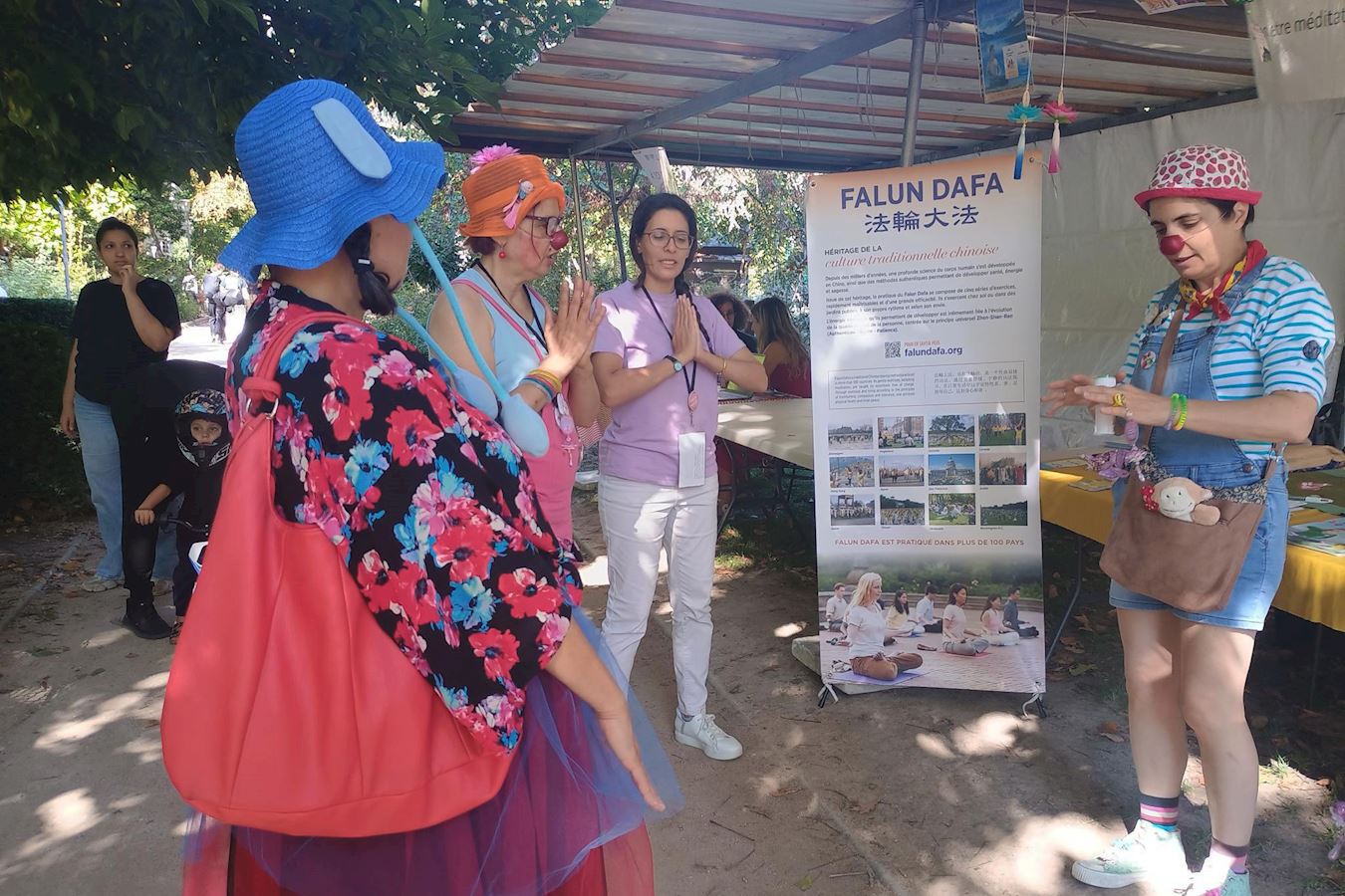 “社区共享”协会的喜剧演员们也来到法轮功展位前,开始学炼功法。演员们在炼习过程中越来越放松,其中一位非常感动,摘下小丑鼻子向法轮功学员讲述她感受到的好处。