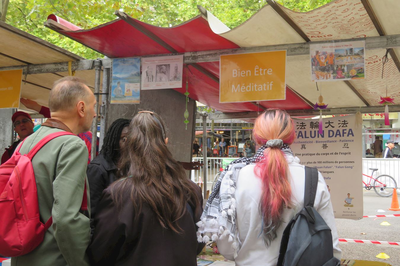 图8:“社区共享”协会的喜剧演员们来到法轮功展位前,开始学炼功法。