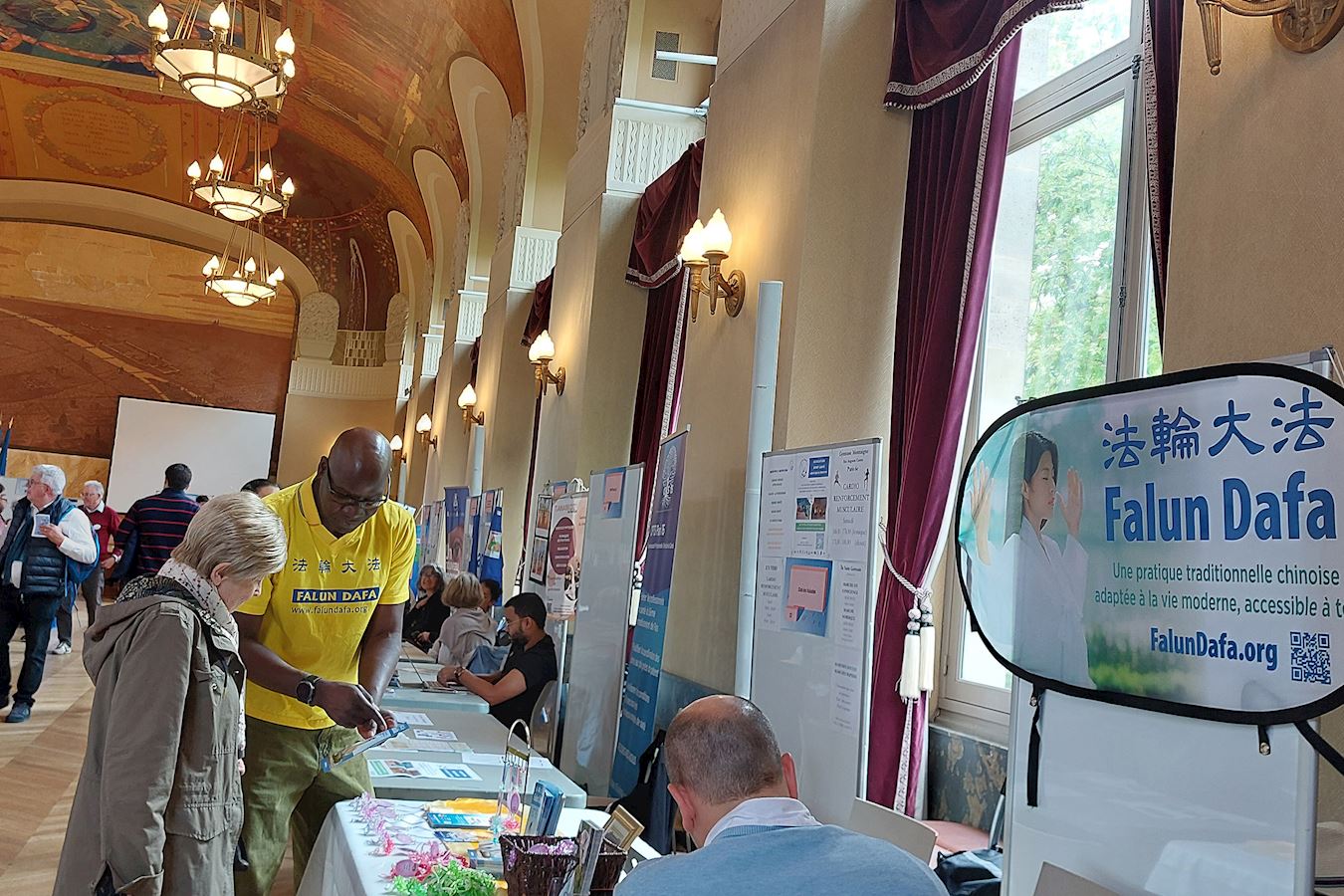 九月十三日,法轮功学员在巴黎十五区宴会厅举行的协会论坛上,不少民众乐见法轮功展位,向学员询问炼功点讯息,并用手机上网了解法轮功。