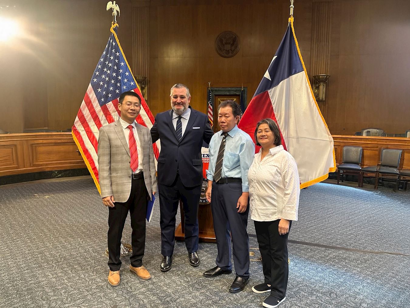 ![]() 图1~2:二零二五年九月十六日,在美国参议院德克森办公楼,来自德克萨斯州的法轮功学员宇昊和父母向泰德·克鲁兹参议员(左二)递交十封来自德州议员的支持和感谢信,感谢克鲁兹参议员在国会参议院提出《法轮功保护法案》。 |