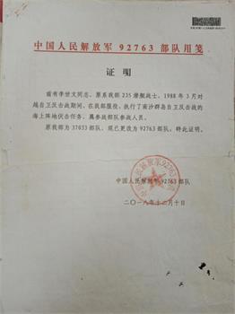 等来的回信是“参战的目录里没有你”。再去找凤城市民政局的张崇彪,被告知他调走了,工作由代闯接管。代闯让我自己找证据。我把参战时中国人民解放军政治部海军报刊登的:辽宁省凤城县丝绸厂优先给参加保卫南沙群岛自愿兵李世文同志家属安排住房的报纸给了凤城市民政局,同时也给了他们我同一潜水艇参战的战友拿到了优抚金的证明和他们的手机号码,可是凤城市民政局给我的答复是:新闻报刊不是正规文件。你的战友证明不在我凤城市所管之内,无法查询。