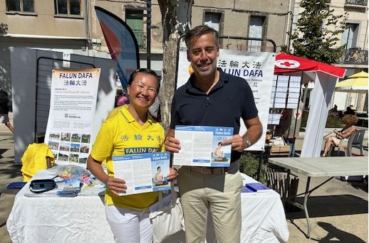 活动期间,阿格德市长塞巴斯蒂安·弗雷(Sébastien Frey)先生来到法轮功展位,向法轮功学员致意。