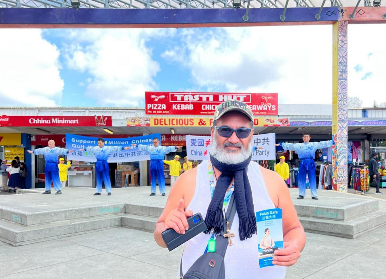 ![]() 图1:二零二五年九月二十七日星期六,新西兰奥克兰法轮功学员在奥塔瓦市场(Otara market)集体炼功。 |