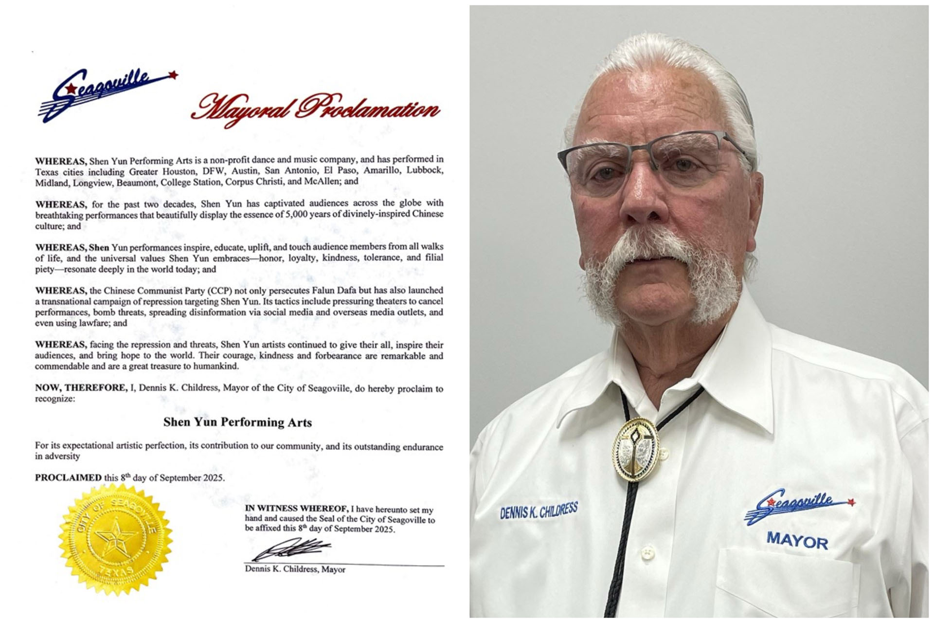 ![]() 图5:二零二五年九月八日,德克萨斯州西戈维尔市长丹尼斯·K·奇尔德里斯(Dennis K. Childress)向神韵颁发褒奖。 |