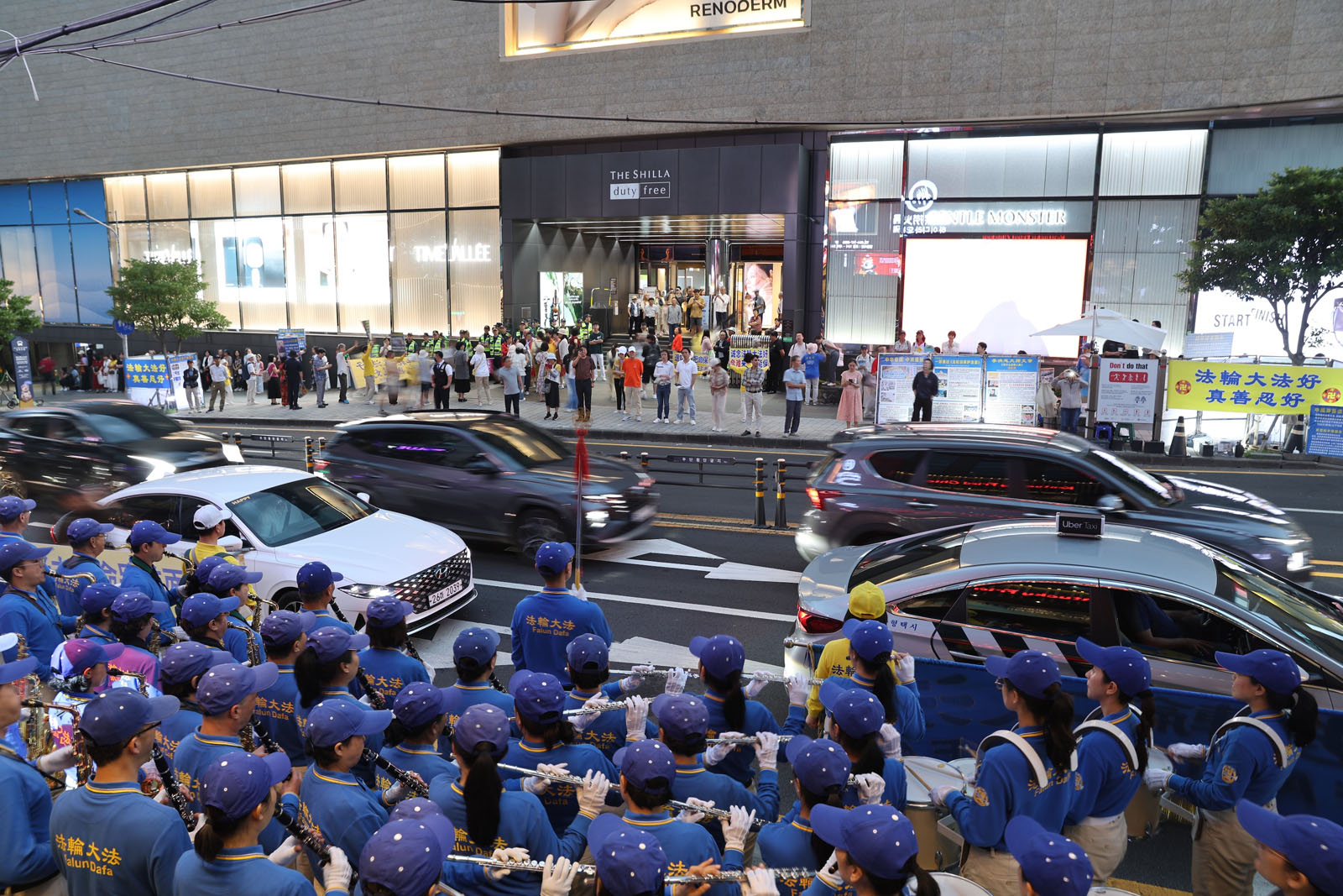 随后,天国乐团又到约五百米外的新罗免税店门口演奏。场面同样壮观,大批游客瞬间涌出正门,短短百米区域人山人海。因为进入新罗免税店必须经过正门,游客购物途中听到音乐纷纷出来,拿手机拍摄,或认真阅读展板。部份会中文的学员穿梭人群讲真相,不少中国游客当场办理“三退”。