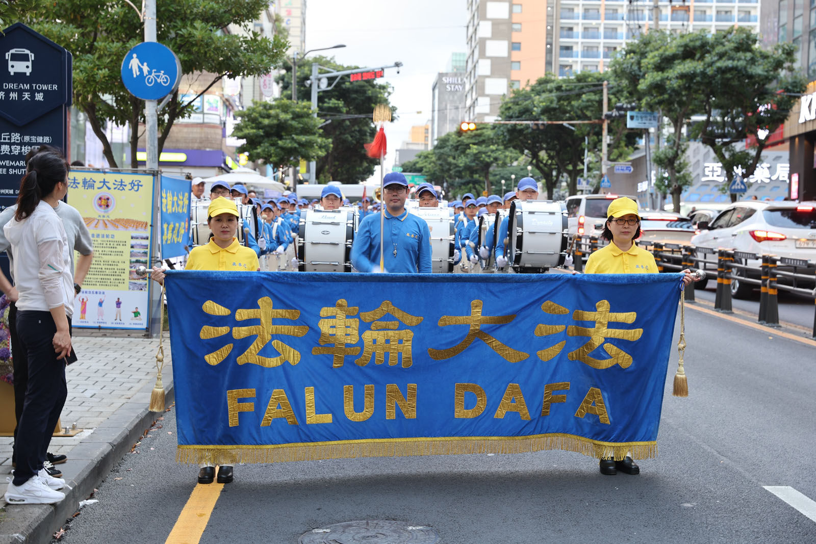 法轮功学员早早来到济州港码头,最前方挂上了“欢迎来到济州”的横幅。当第一批游客出来时,天国乐团奏响了《法轮大法好》,许多中国游客面带笑容,挥手致意。一些勇敢的中国游客忙着拍摄乐团演奏和学员们打出的横幅。