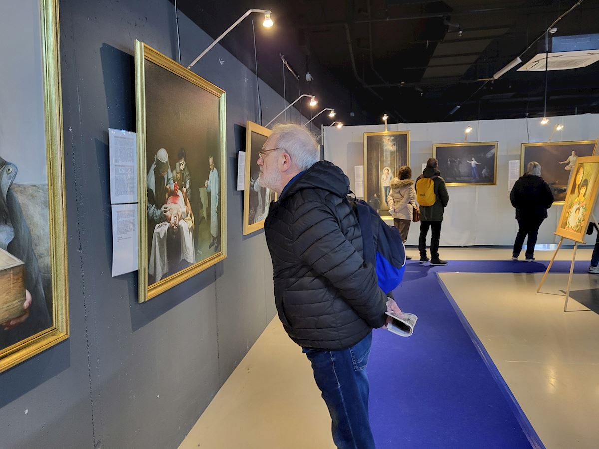 '图1~7:1-7 真善忍国际美术展在比利时第四大城市法语区列日市,二零二五年十二月十二日至二零二六年一月十一日一个月的展出。参观人员络绎不绝。'