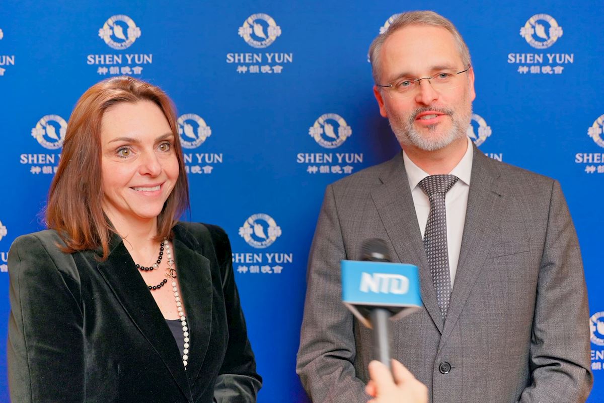 '图11:二零二六年一月九日晚,波兰一家律师事务所的创始人兼管理合伙人马尔钦·斯沃姆斯基(Marcin Słomski,右)与医生安娜·梅克-斯沃姆斯卡(Anna Mec-Słomska)一起在罗兹观赏了神韵演出。(新唐人电视台)'