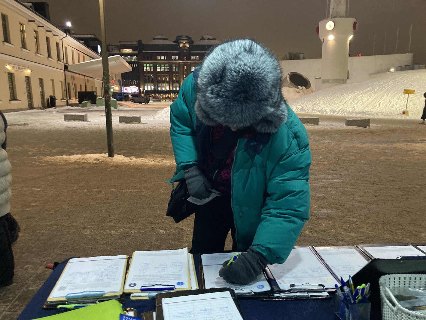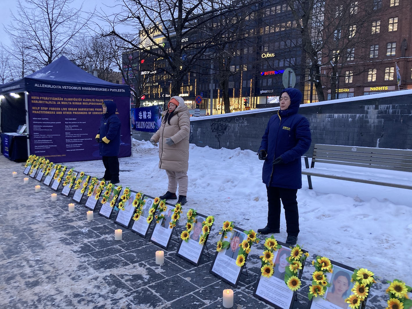 当天,芬兰的法轮功学员在首都赫尔辛基约摄氏零下 10 度的严寒中举行烛光守夜活动,向公众讲述中共对法轮功长达 27 年的迫害事实。学员们介绍,这场迫害导致大量修炼者遭受酷刑、致伤致残,甚至失去生命,并揭露中共在中国境内持续发生的活摘器官罪行——这一罪恶已渗透至社会多个层面。