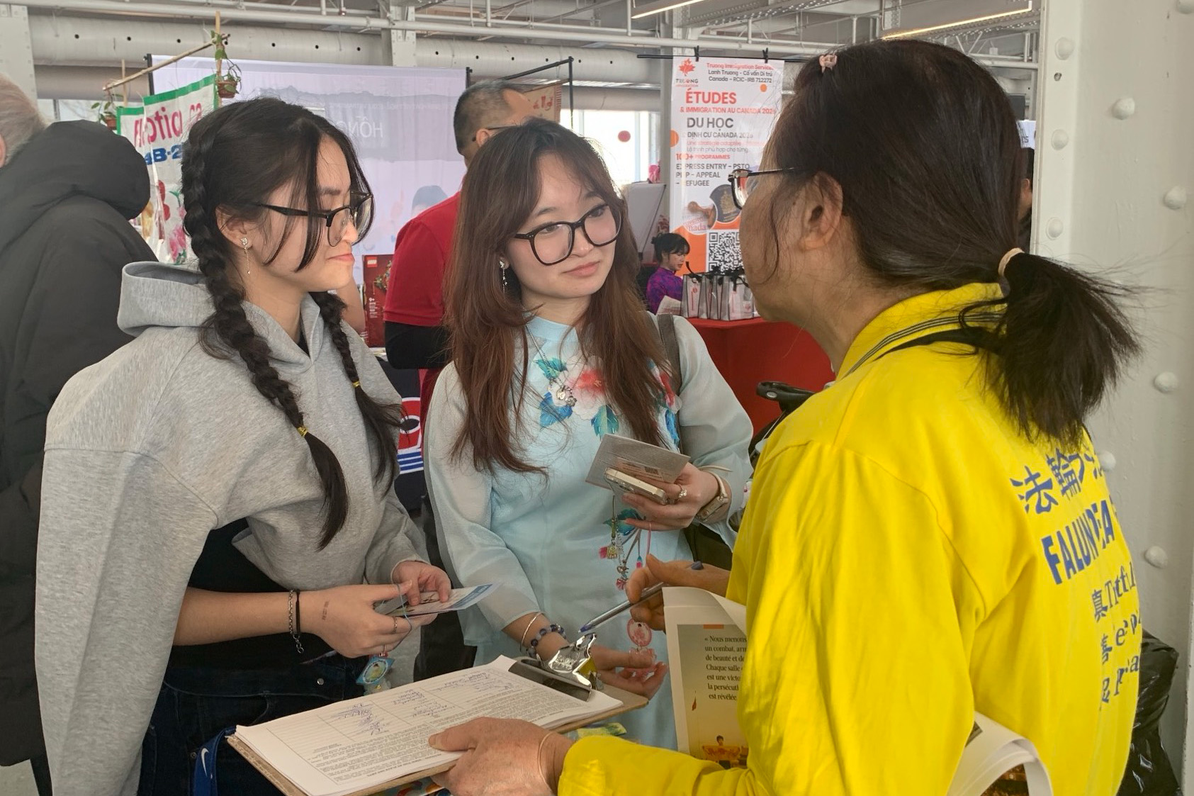 Phuong 女士与丈夫都是活动主委会的成员,他们来到展位上。Phuong 女士表示,她先前就曾听说过法轮大法,但一直没有机会深入了解。在听完法轮功学员的介绍后,Phuong女士对修炼功法表现出兴趣,并在拿到义务教功联络电话后非常高兴,表示会拨打电话加入集体炼功。