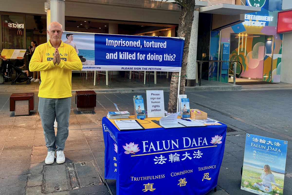 黄金海岸真相点是在旅游胜地冲浪者的天堂,几步之遥便是绵延的海岸线和海边集市,还有步行街上的各种表演,吸引了当地和世界各地的游客,人群涌动,热闹非凡。法轮功的展位非常醒目,有展示的横幅、功法表演和征签,前来了解真相和签名的众生络绎不绝。