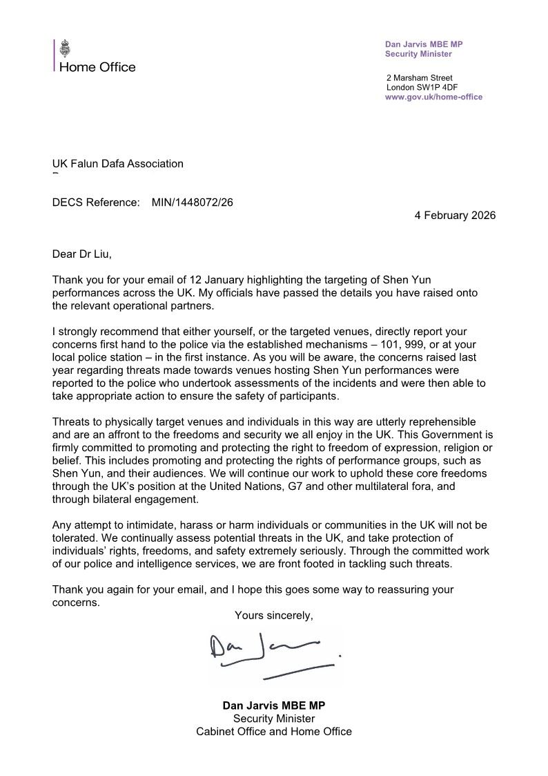 这是继一月二十三日英国外交部致函英国法轮大法学会、明确表达政府坚决反对中共特务以恐吓方式干扰神韵演出的立场之后,英国政府再次就相关问题作出清晰表态。作为英国政府中专门负责反恐、应对外国敌对势力威胁与公众安全事务的高级官员,贾维斯的回函进一步重申了政府在此问题上的坚定立场。