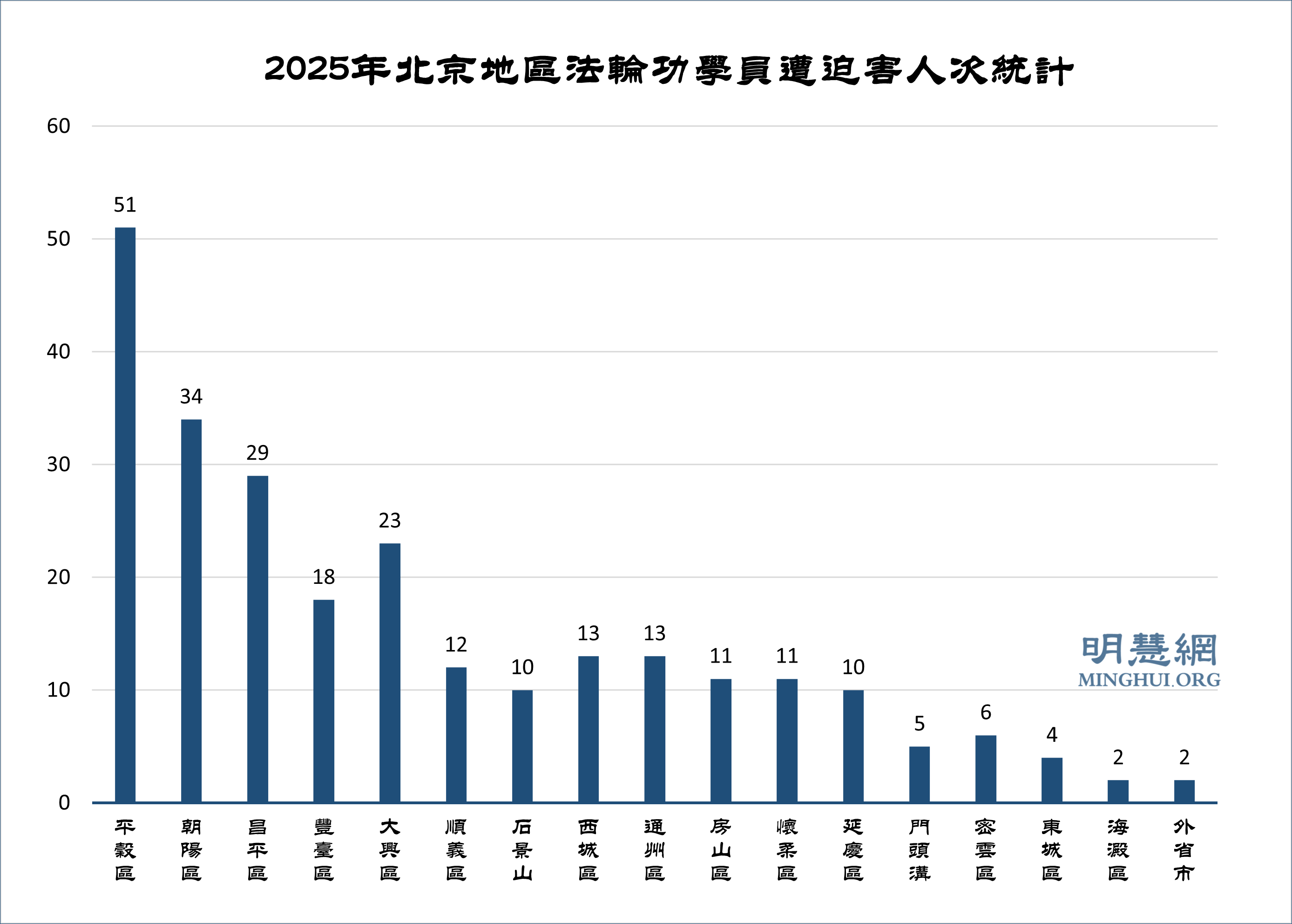 根据明慧网报道统计,二零二五年北京地区被中共迫害的法轮功学员至少254人次。
