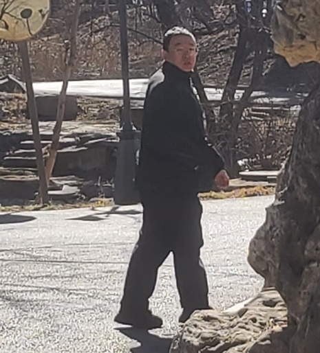 图片中戴眼镜的人就是街道办事处派来的监控人员,他表现的特别卖力,在用手机实时报告学员外出情况时还污蔑学员要打他、骂他。另一张图片中骑在电动车上的人(红色箭头)和他是一伙的,也是监控学员的。还有他们住的汽车的图片。