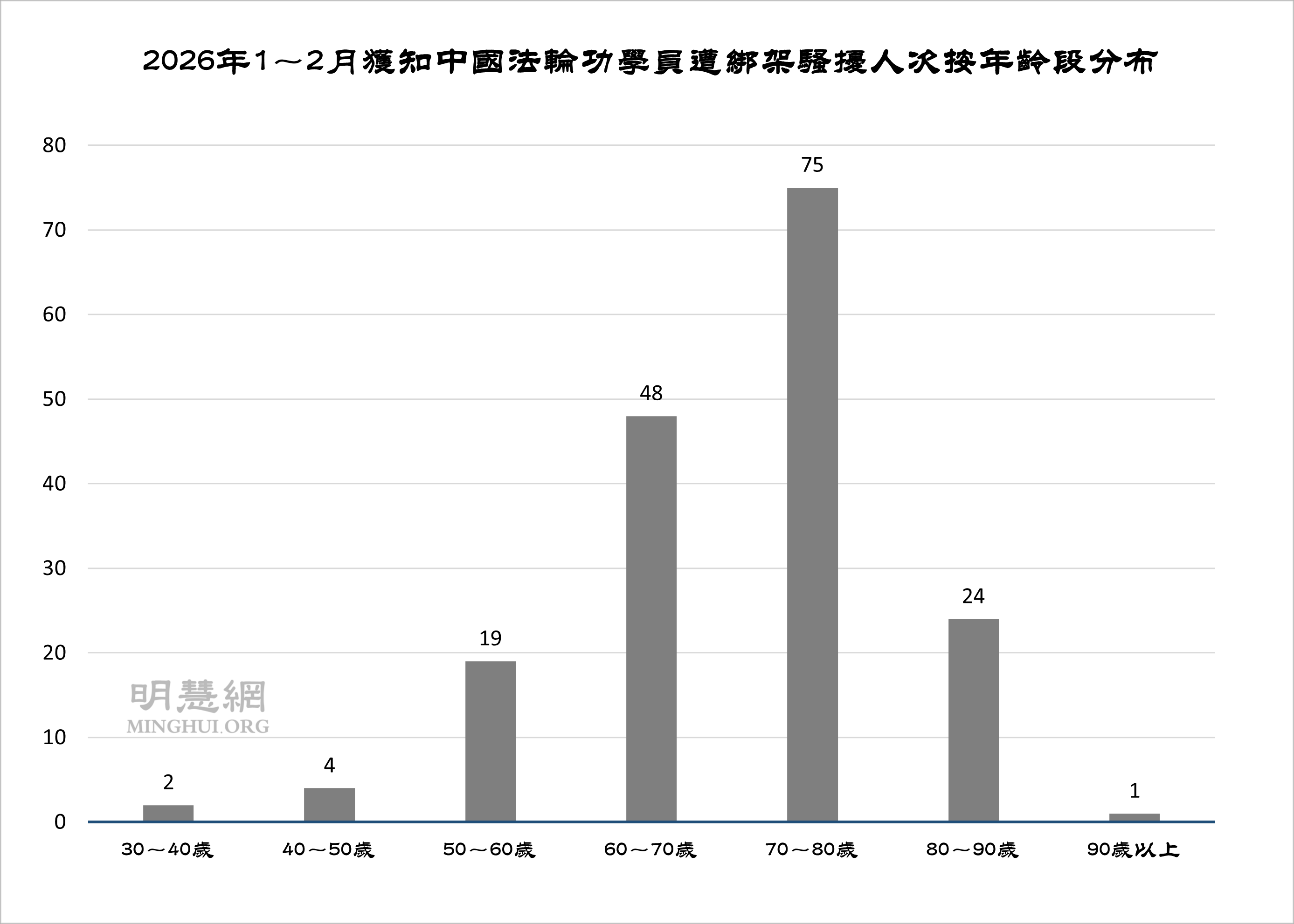 ![]() 图3:2026年1~2月获知中国法轮功学员遭绑架骚扰人次按年龄段分布 |
