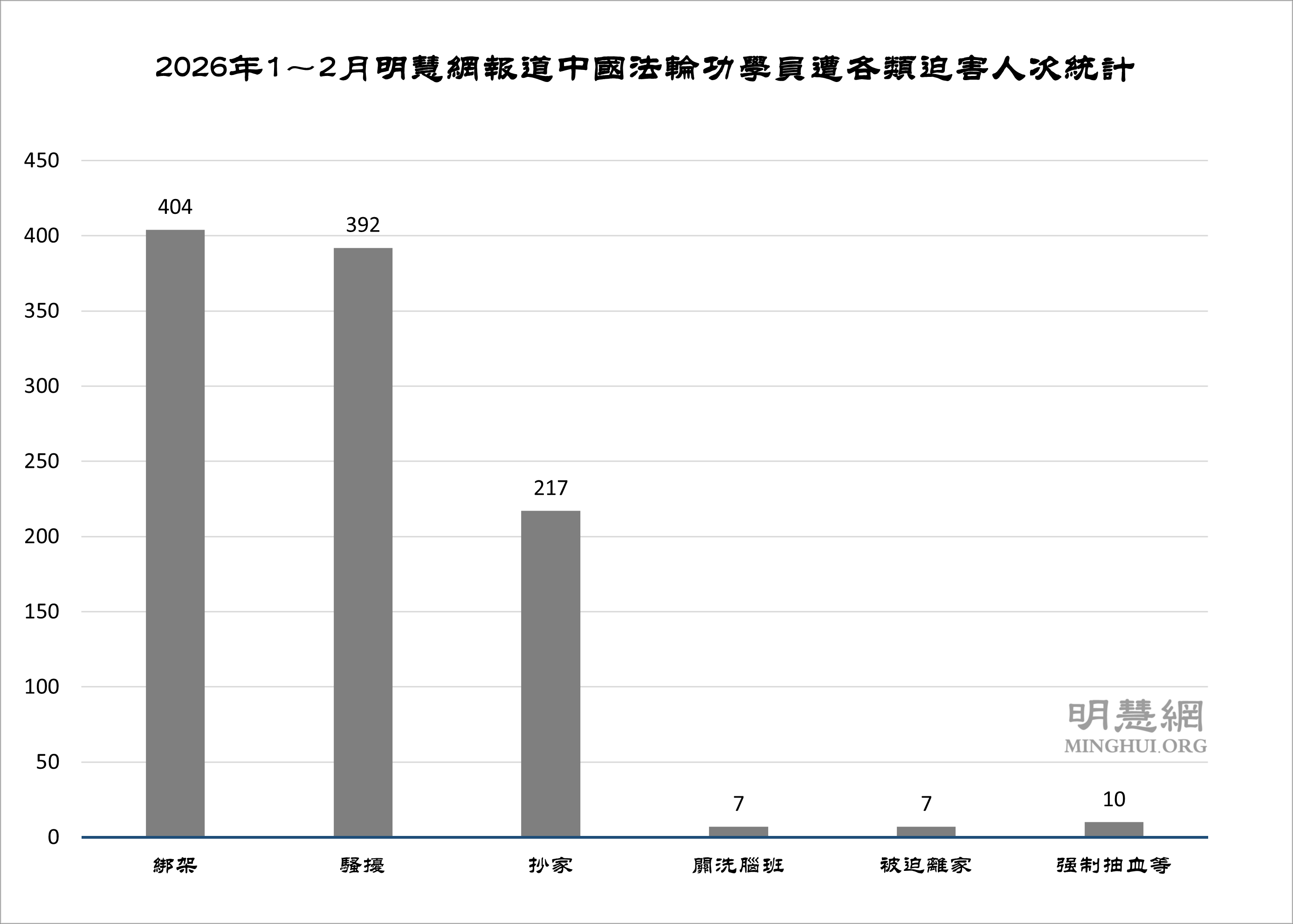 ![]() 图1:2026年1~2月明慧网报道中国法轮功学员遭各类迫害人次统计 |