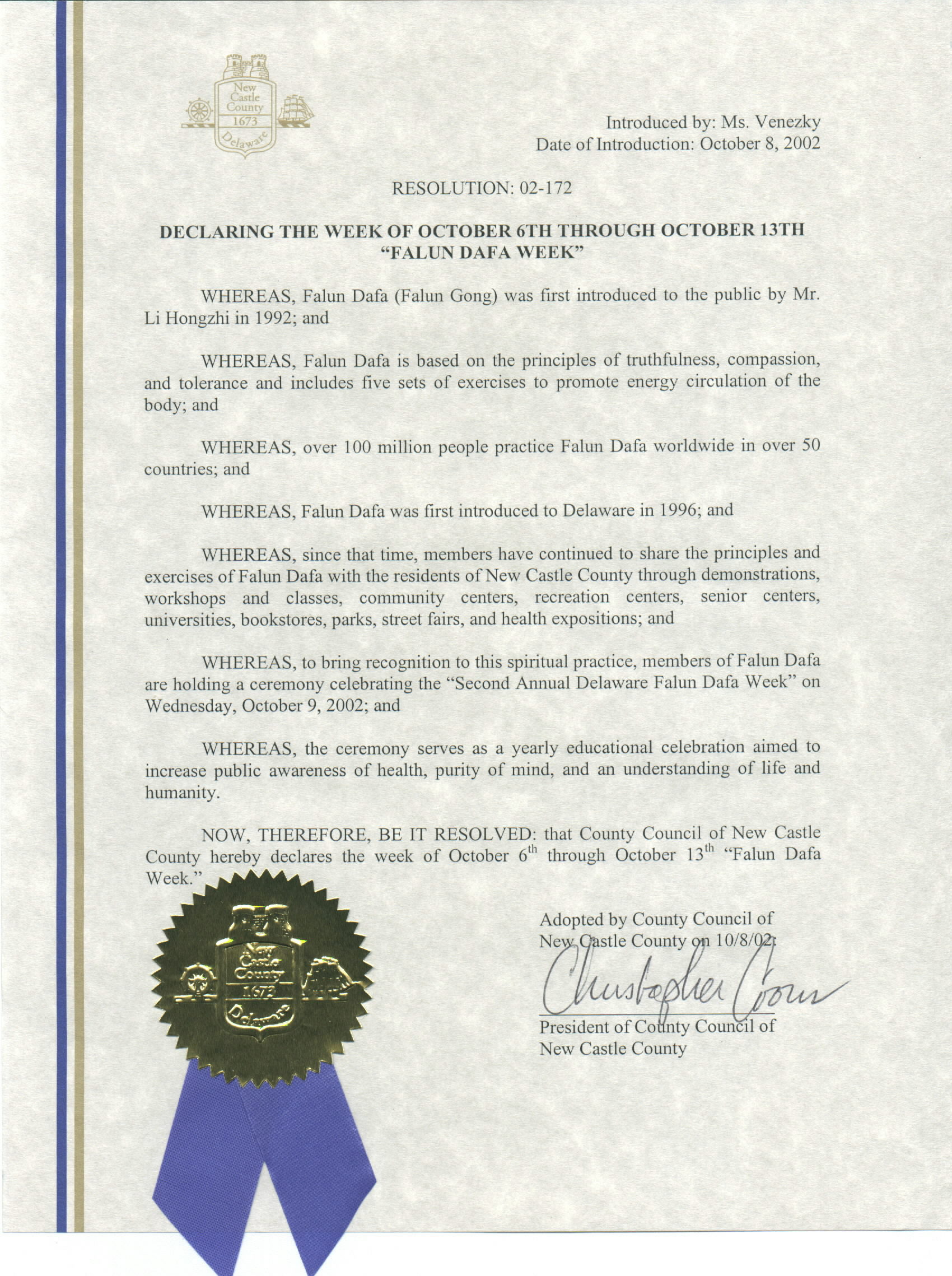特拉华州新城堡郡宣布“法轮大法周” |