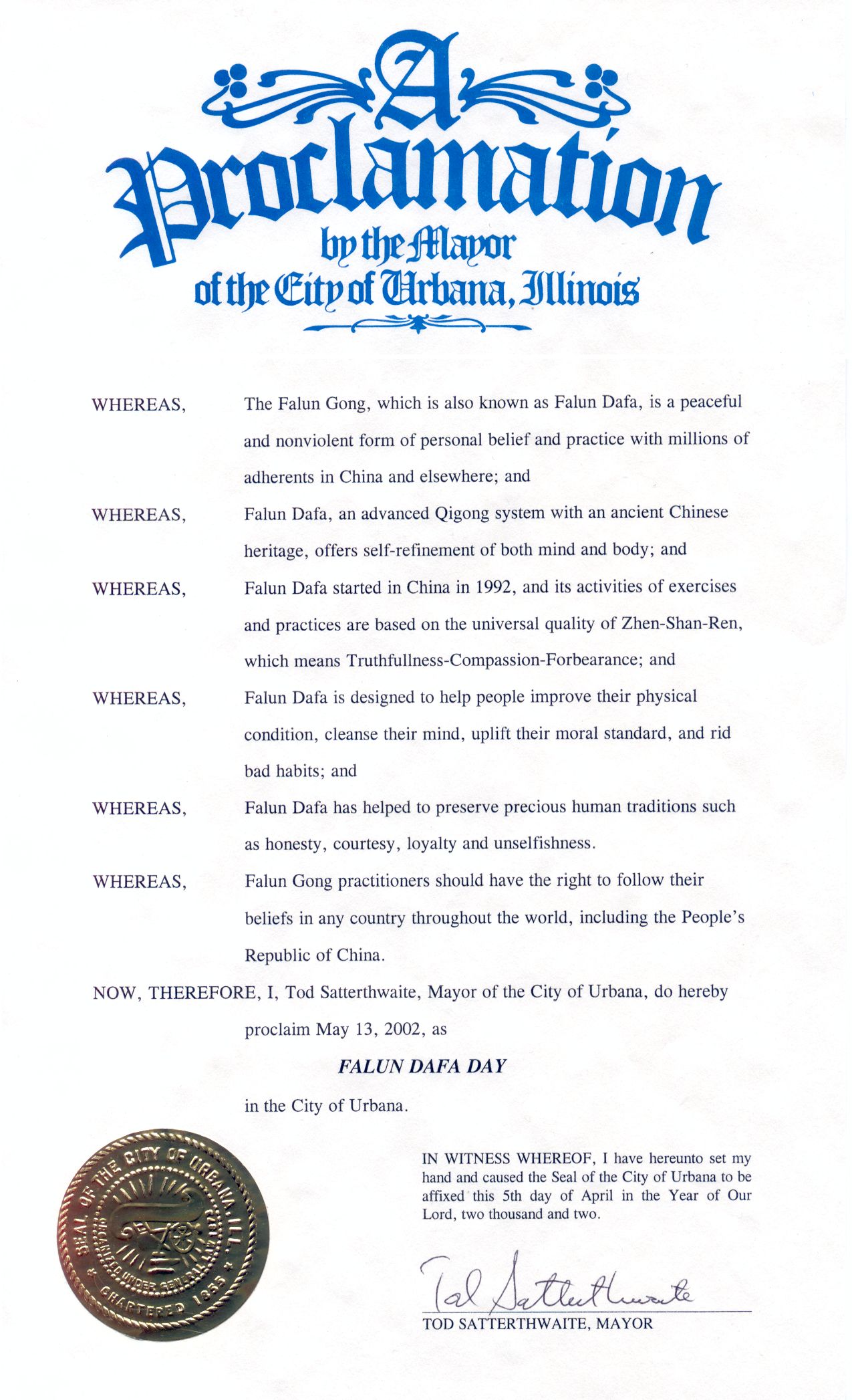 美国伊利诺依州厄尔巴纳市市长褒奖法轮功 |