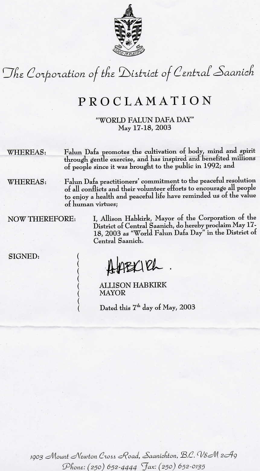 加拿大不列颠哥伦比亚省萨尼克顿市中萨尼克区褒奖“世界法轮大法日” |