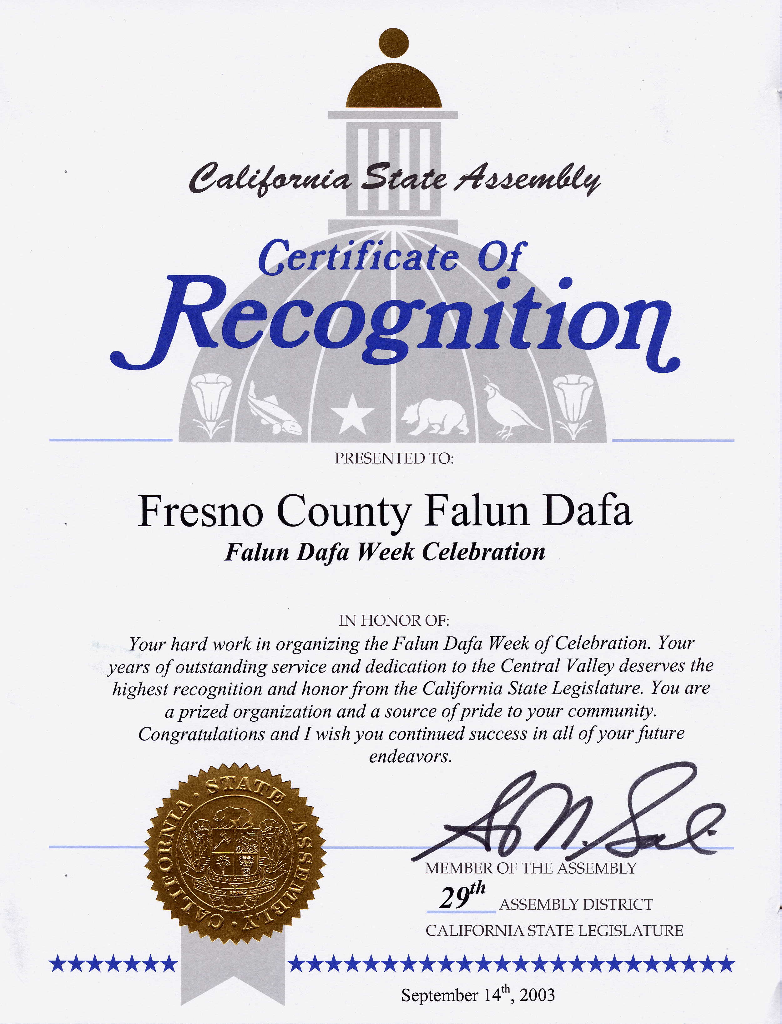 加州众议院29选区众议员褒奖弗莱斯诺县法轮大法周 |