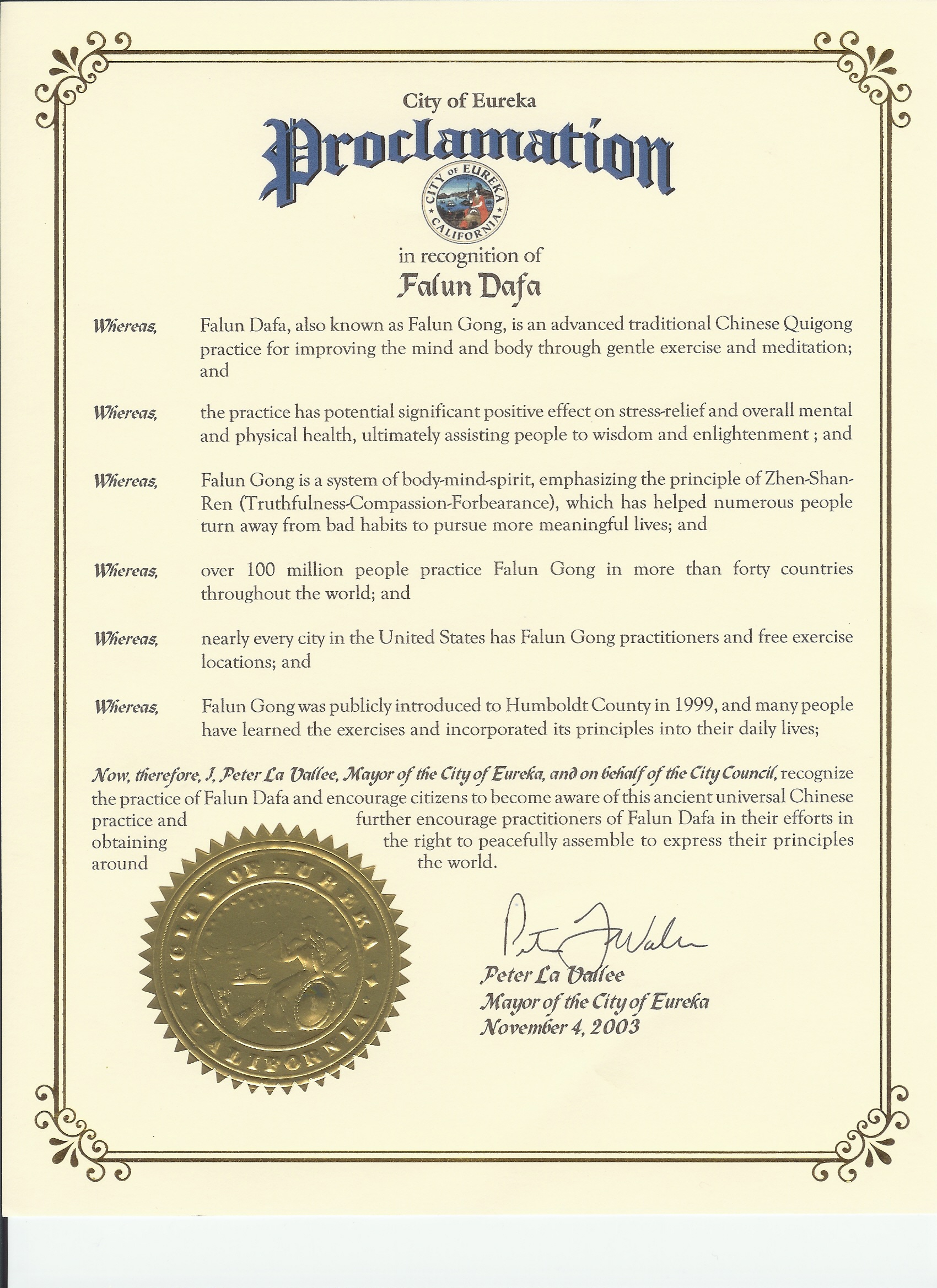 加利福尼亚州尤利卡市褒奖法轮大法 |