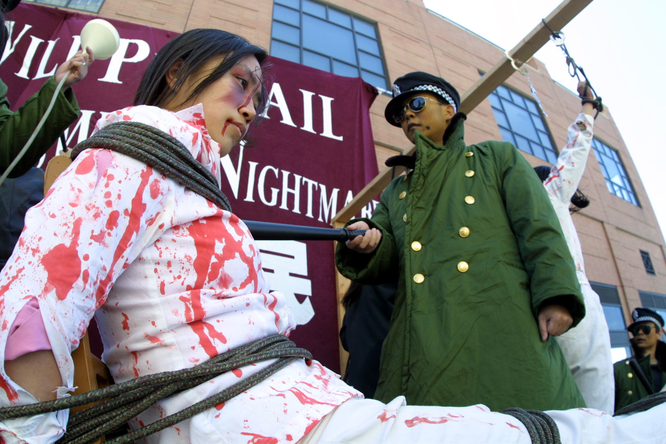 五迎“四.二五” 纽约学员中领馆前模拟公审江泽民 |
