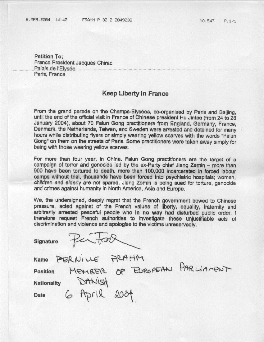维护法国的自由 丹麦欧洲议员要求无保留向法轮功学员道歉 |