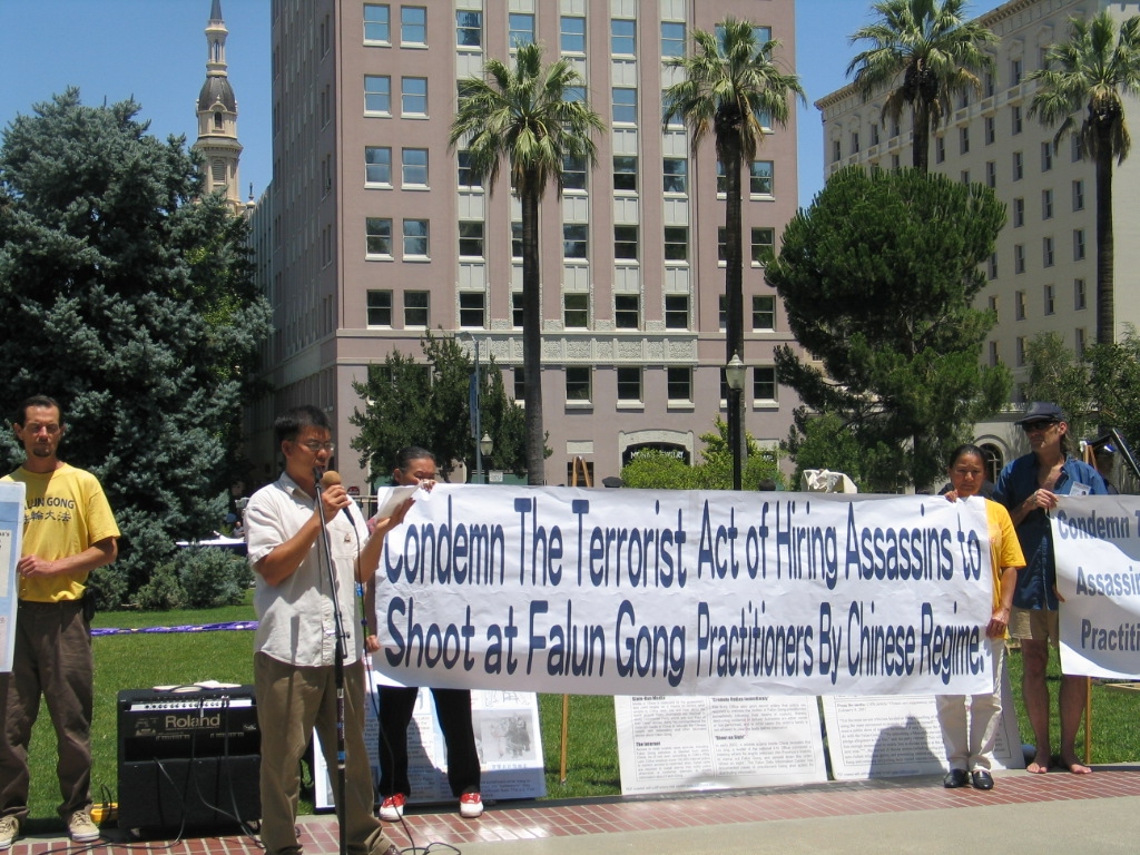 | 法轮功学员在加州州府强烈谴责江氏集团雇凶杀人(图) |