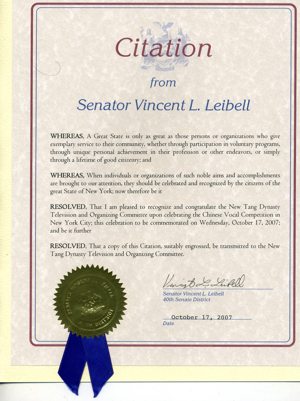 (1118KB)纽约参议员雷贝尔嘉奖全世界华人声乐大赛 (2007-10-17发表)