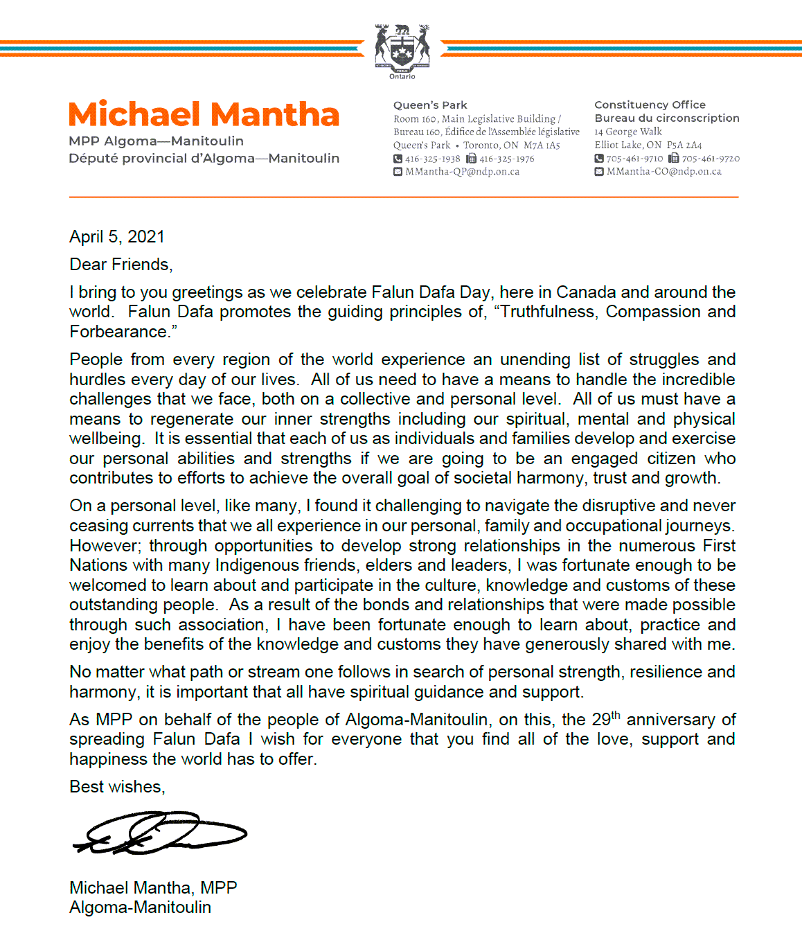 加拿大政要恭贺法轮大法弘传廿九周年(八) 【明慧网】 (2021-5-27发表)