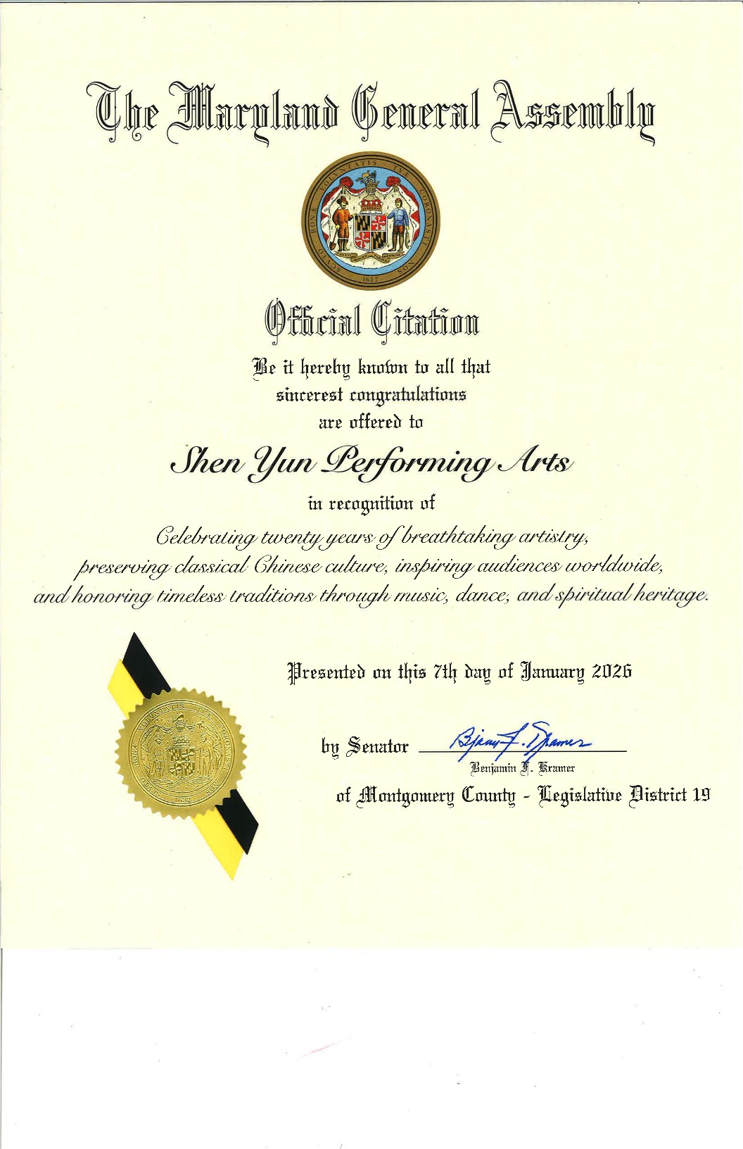 美国马里兰州参议员褒奖神韵艺术团 【明慧网】 |