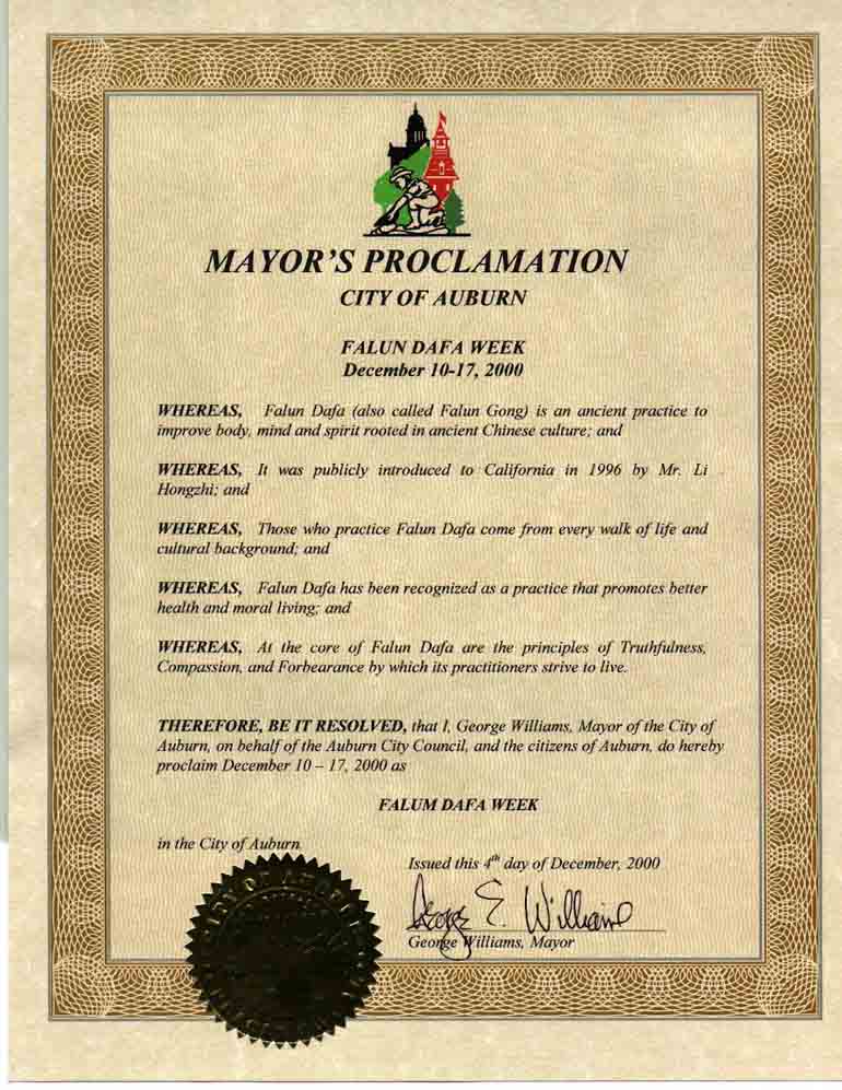 加州奥本市法轮大法周 2000 年12月10日至17日为奥本市法轮大法周(Dec/16/2000发表)