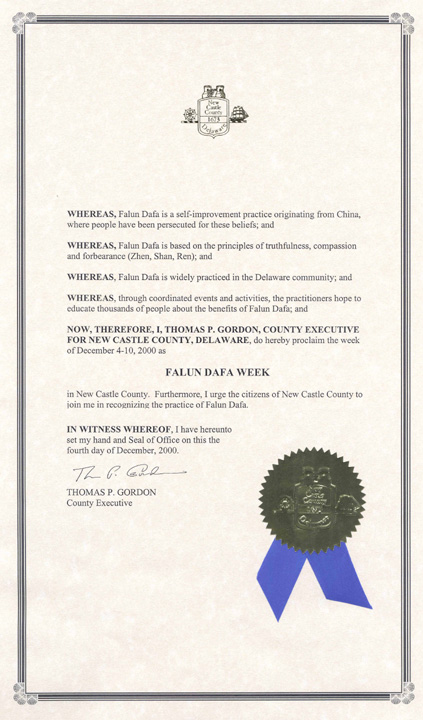 特拉华州纽卡斯尔市“法轮大法周”褒奖令 法轮大法周: 2000年12月18日至23日(Dec/17/2000发表)