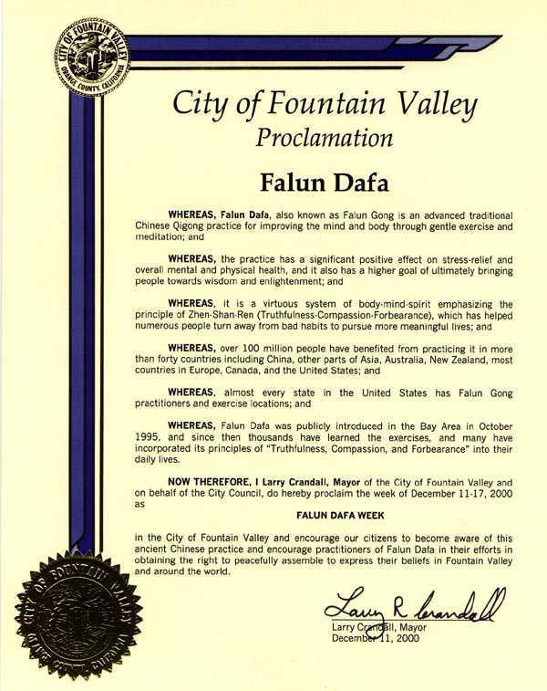 加州喷泉谷市宣布法轮大法周 (Dec/11/2000发表)